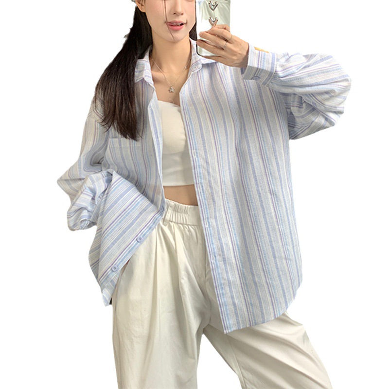 蓝条纹polo领长袖衬衫女薄款春秋季慵懒风宽松防晒衬衣中长款上衣
