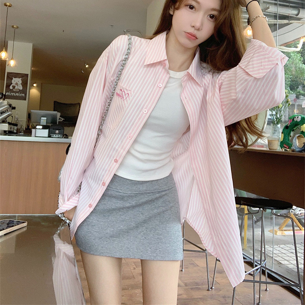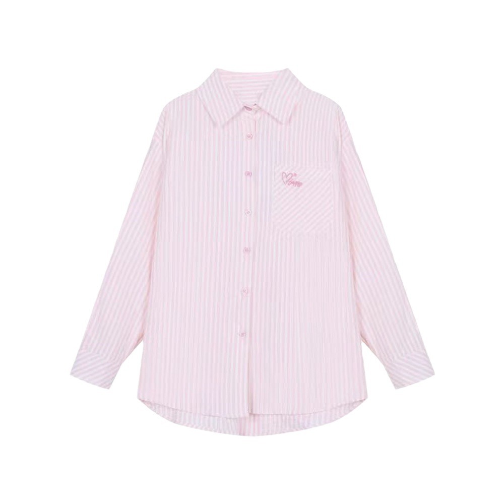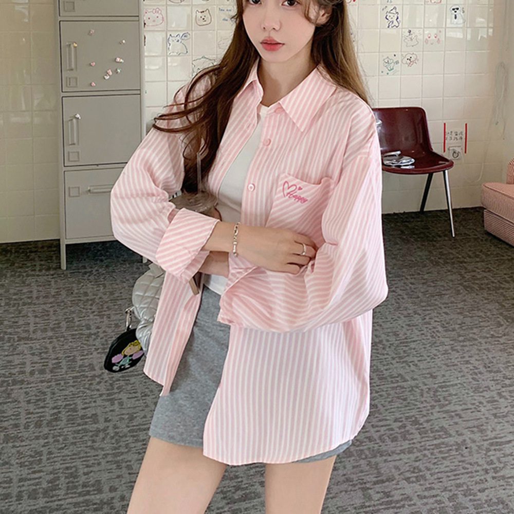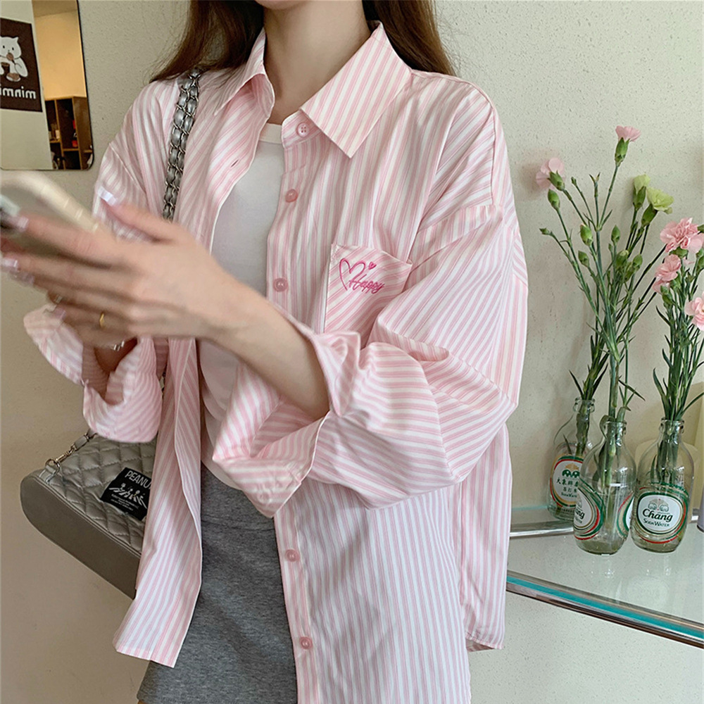刺绣条纹衬衫外套女夏季防晒休闲衬衣宽松中长款开衫百搭上衣薄款