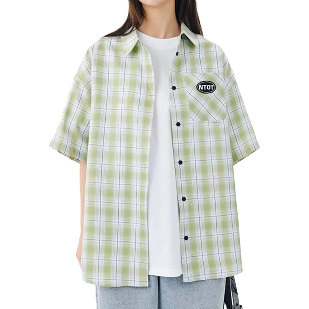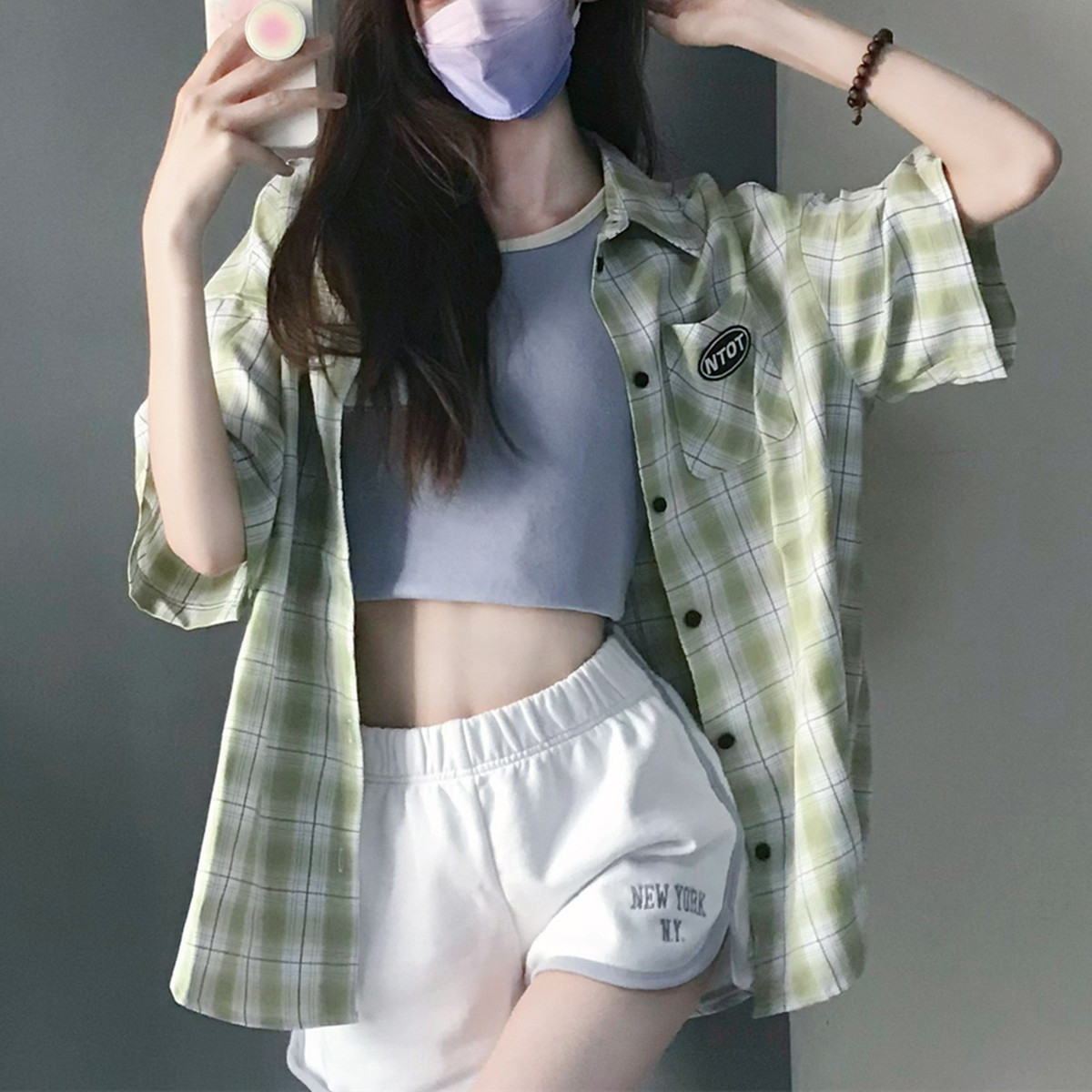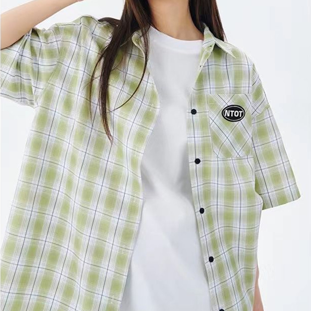 绿色格子短袖衬衫女夏季新款设计感宽松中长款Polo领衬衣外套上衣
