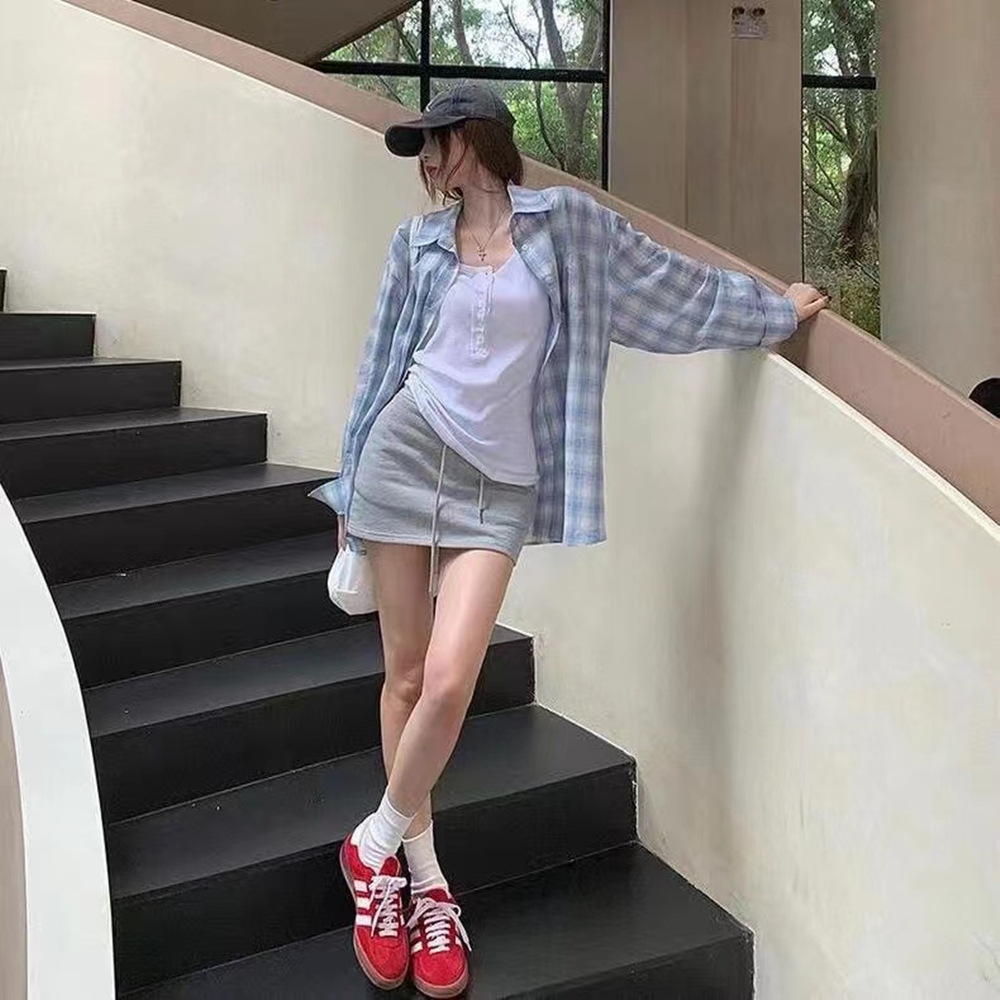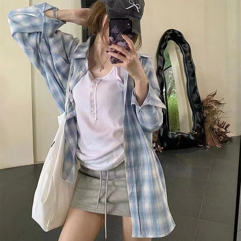 慵懒风Polo领格子长袖衬衫女款夏季薄款休闲宽松防晒衬衣外搭上衣
