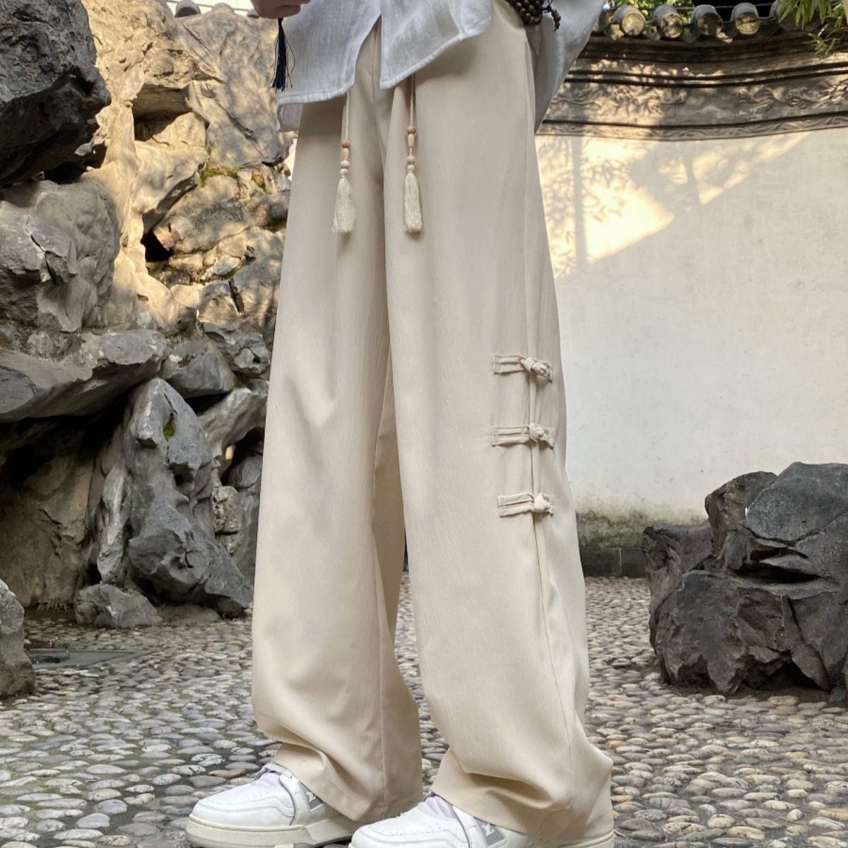 新中式国风盘扣冰丝西裤男夏季薄款休闲裤子宽松直筒微喇阔腿裤潮