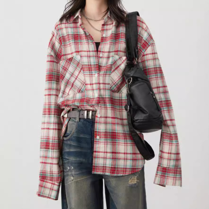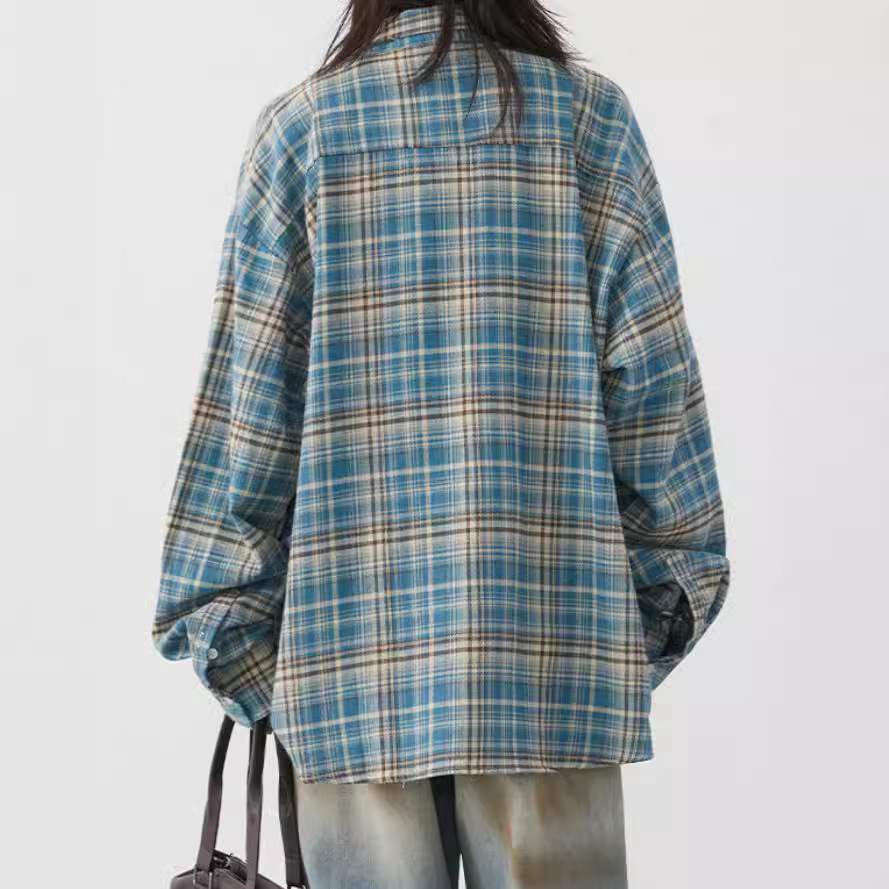 「非正式学院风」秋季美式复古翻领拼色格纹衬衫显瘦气质荃棉衬衣