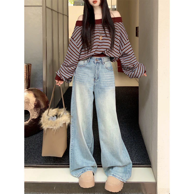 新款复古阔腿牛仔裤女高腰显瘦字直筒拖地长裤女