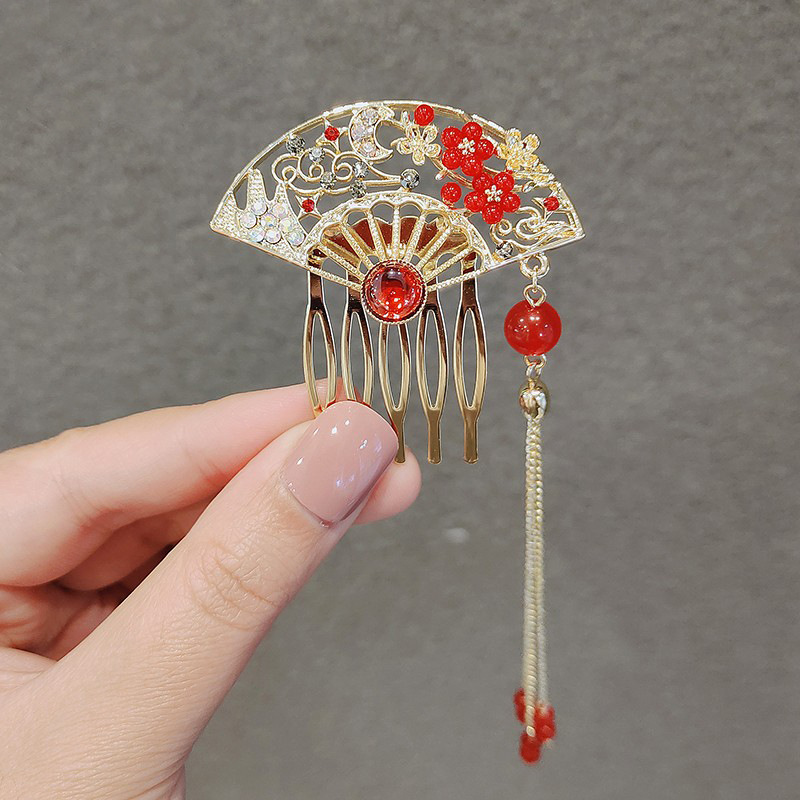 国风扇子步摇发簪头饰汉服流苏古风发梳喜庆插梳刘海发卡盘发头饰