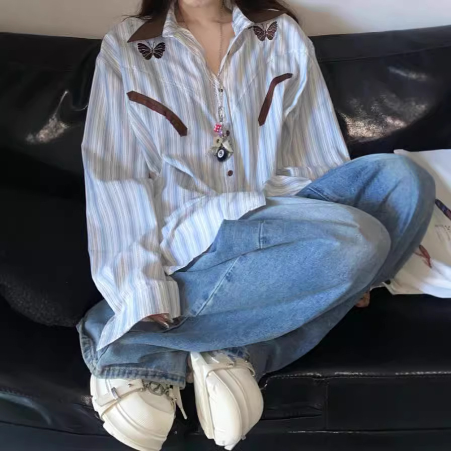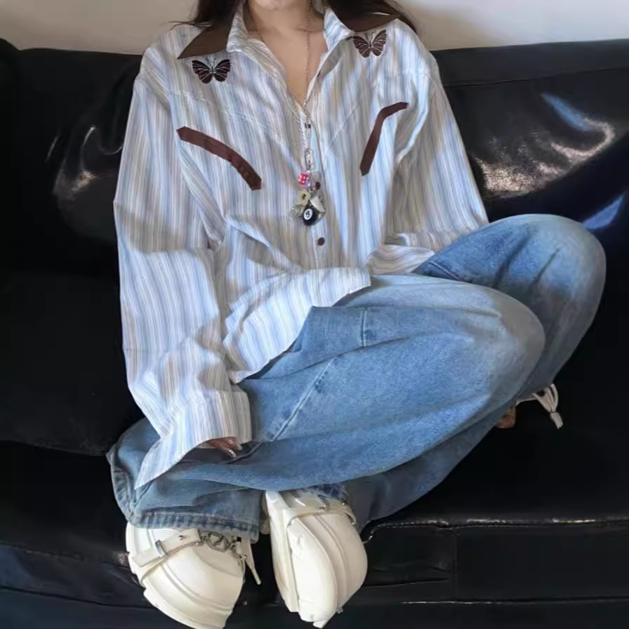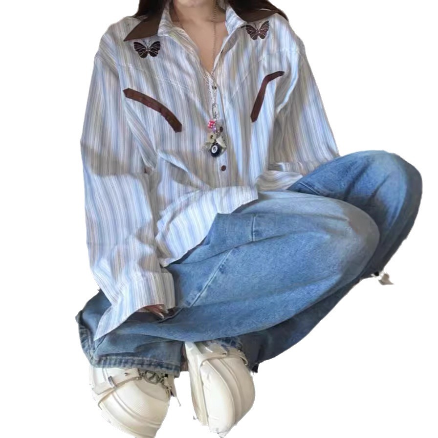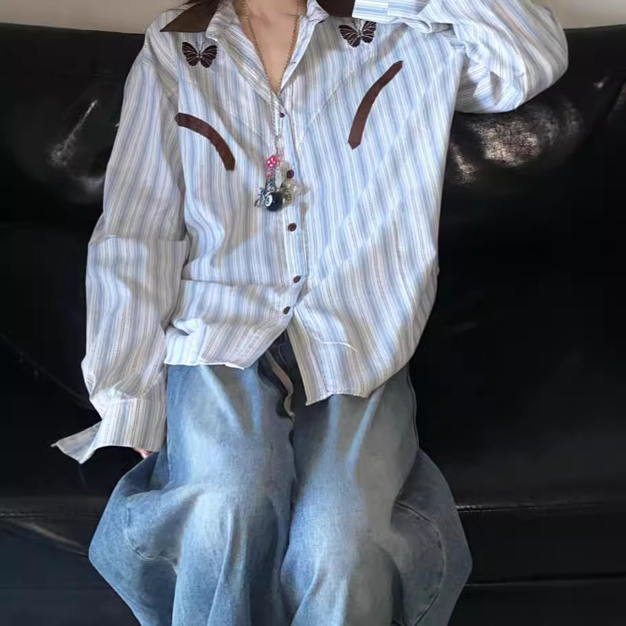 新款温柔慵懒拼色设计感小众蓝条纹衬衫外套女宽松防晒衬衣长袖