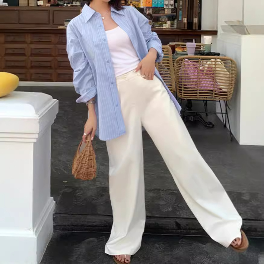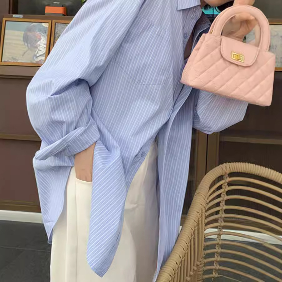高级感蓝色条纹衬衫女韩系早秋新品宽松长袖衬衣设计感小众上衣