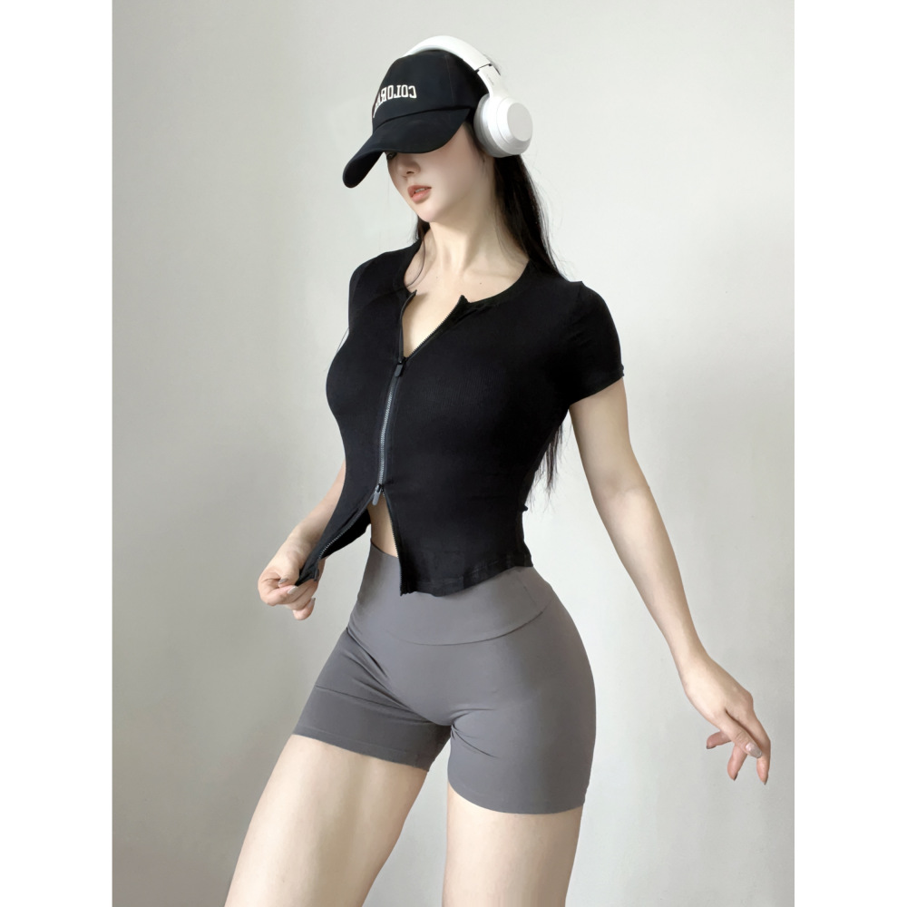 双头拉链细螺纹显瘦透气轻薄跑步运动瑜伽运动修身短袖T恤