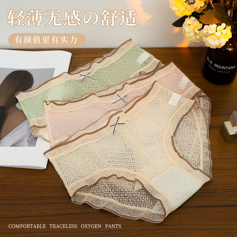 女士轻薄无痕高弹力奶油色系蕾丝性感透气舒适吸湿纯棉底裆三角裤