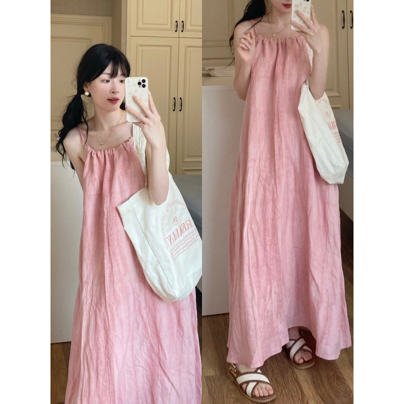 粉色吊带长裙女装夏季新款海边度假沙滩连衣裙挂脖设计感小众裙子