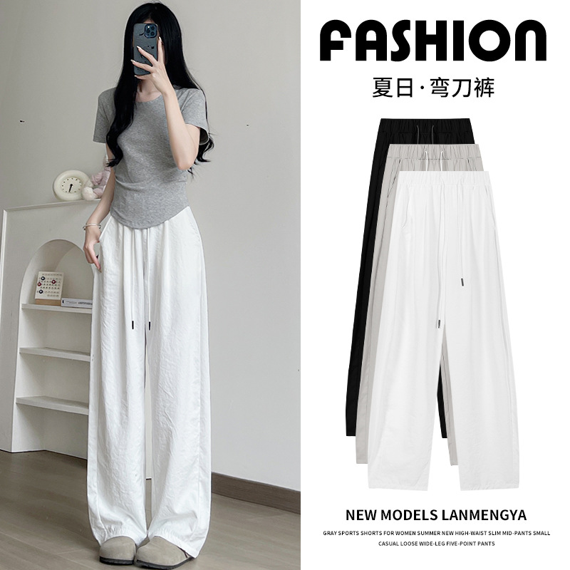 白色弯刀裤女夏季薄款高腰垂感休闲阔腿裤香蕉冰丝直筒缎面运动裤