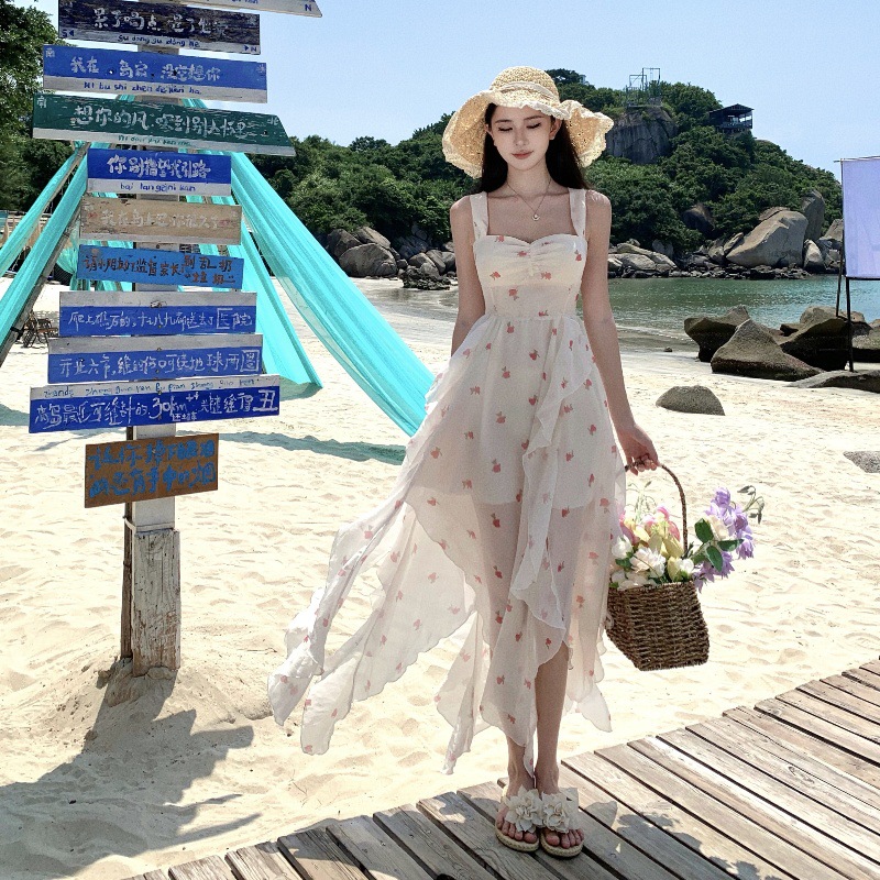 初恋甜美风白色吊带连衣裙花朵印花荷叶边设计背心裙不规则沙滩裙