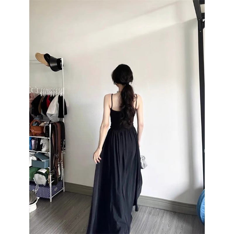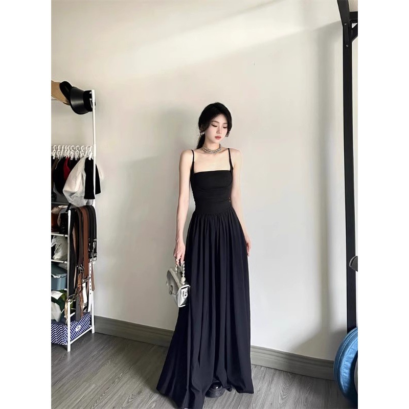 高级感黑色吊带连衣裙女夏季法式赫本温柔风海边度假超好看长裙子
