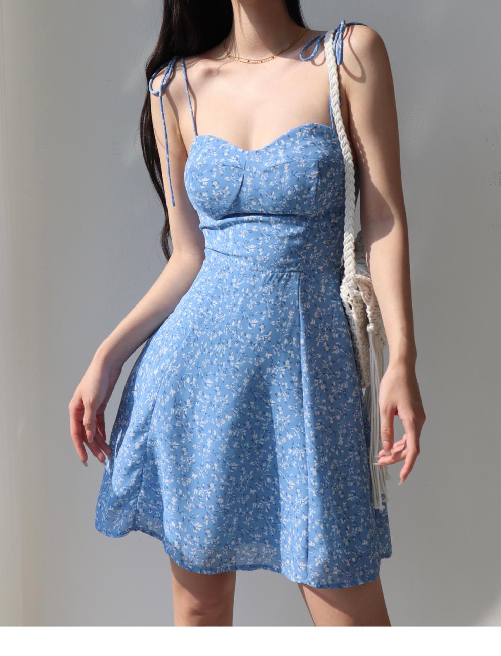 法式复古少女蓝色系带碎花吊带连衣裙女收腰显瘦A字度假风短裙