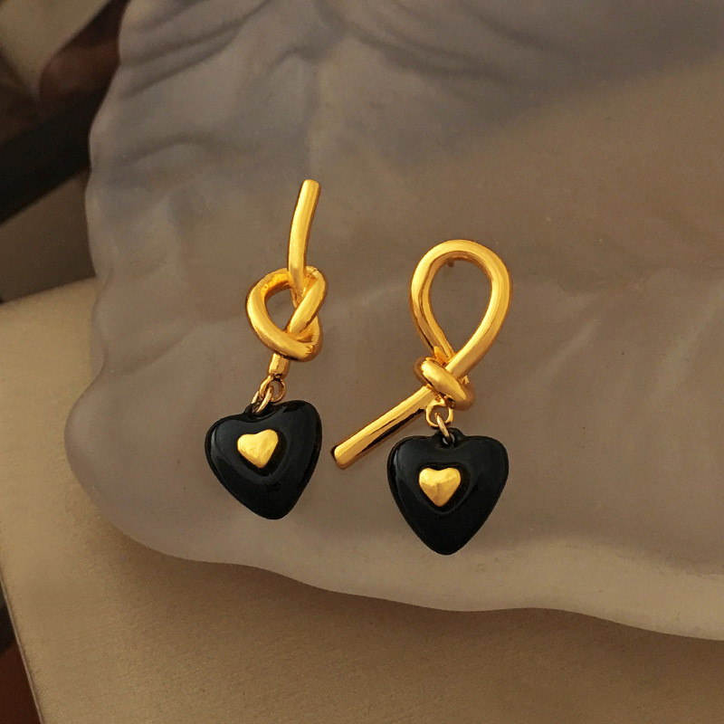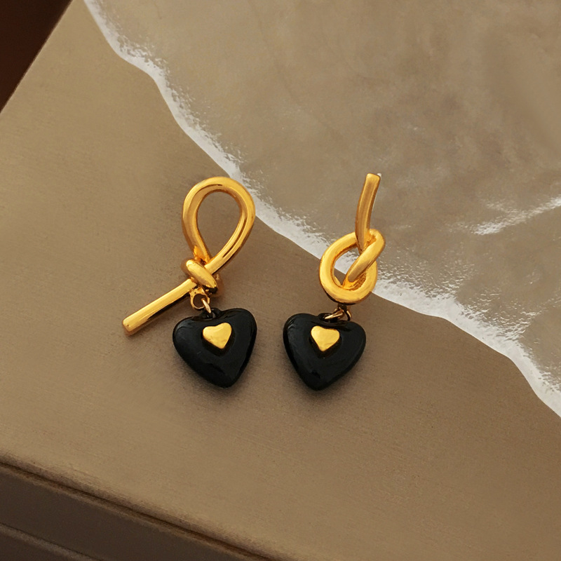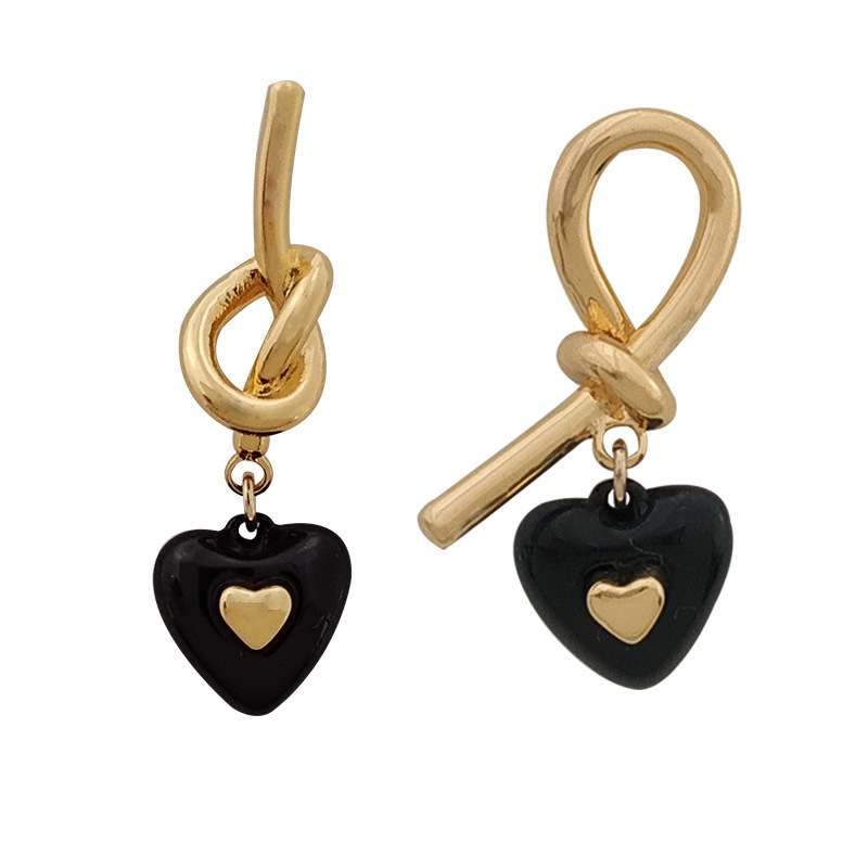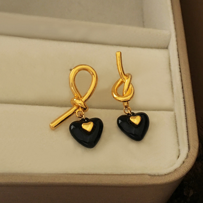 S925银针法式高级感黑色爱心耳钉气质小众不对称绳结设计耳环1893