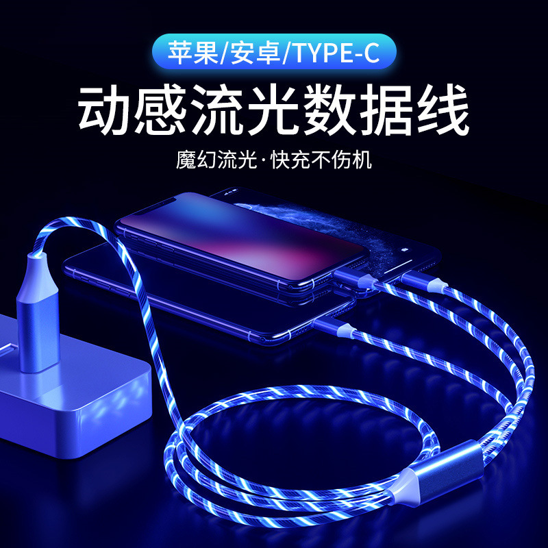 七彩流光数据线发光跑马灯三合一车载充电线一拖三安卓typec通用