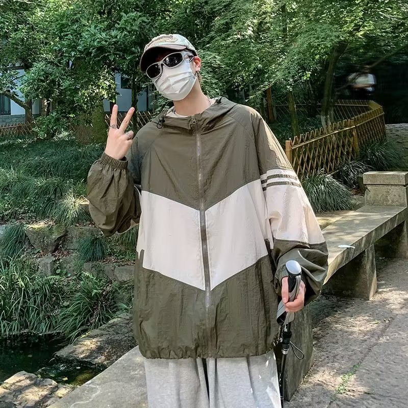 夏季薄款日系复古防晒服男生美式高街百搭拼色户外冲锋衣工装外套