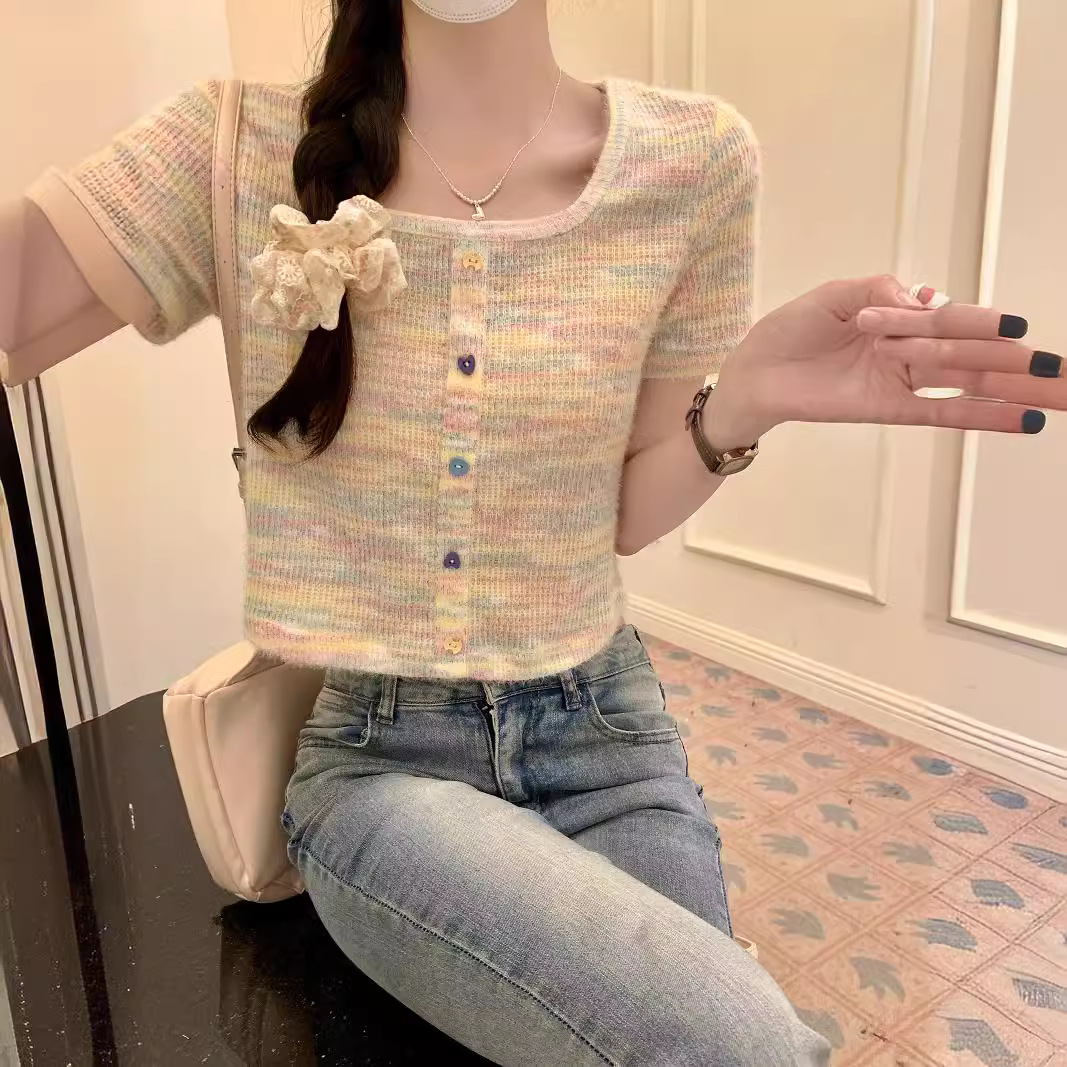 设计感彩虹条纹方领短款上衣女夏季甜辣妹修身显瘦短袖正肩T恤女