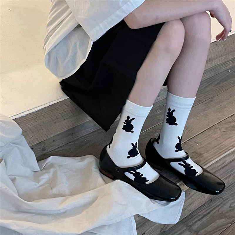 黑白可爱兔子袜子女春秋日系黑白潮袜学院风中筒袜女生百搭棉袜子