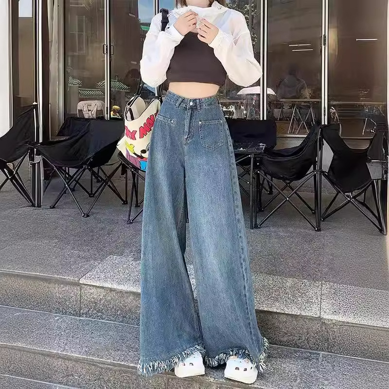 小个子复古超阔腿牛仔裤裙女高腰显瘦遮肉设计感毛边宽松大喇叭裤