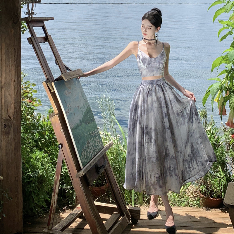 夏季新款女黑白印花法式高腰半身裙裹胸吊带两件套连衣裙