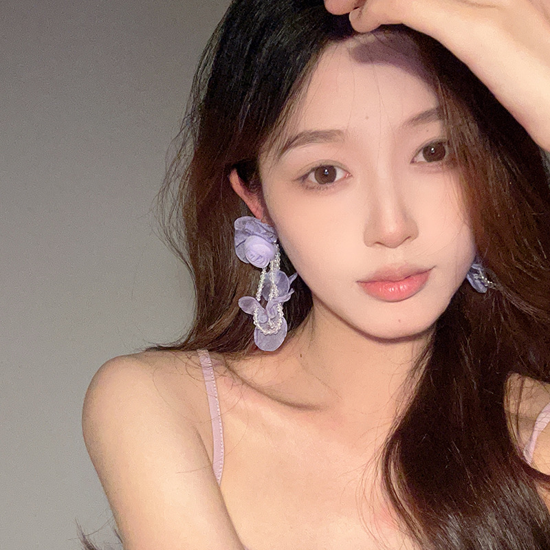 度假风花朵水晶流苏耳环气质夸张小众欧根纱长款耳钉新款潮