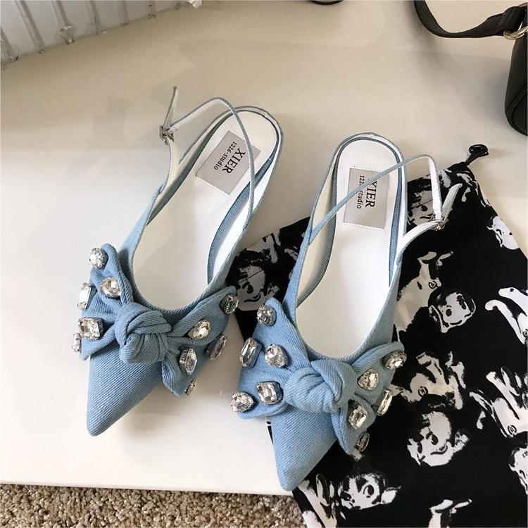 复古百搭气质欧美风水钻蝴蝶结尖头凉鞋女粗跟单鞋女
