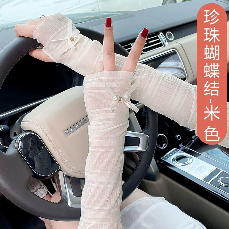 夏季户外防晒冰丝袖套女士珍珠长款冰袖蝴蝶结手臂套冰袖