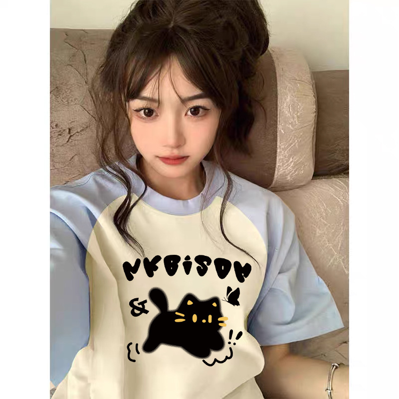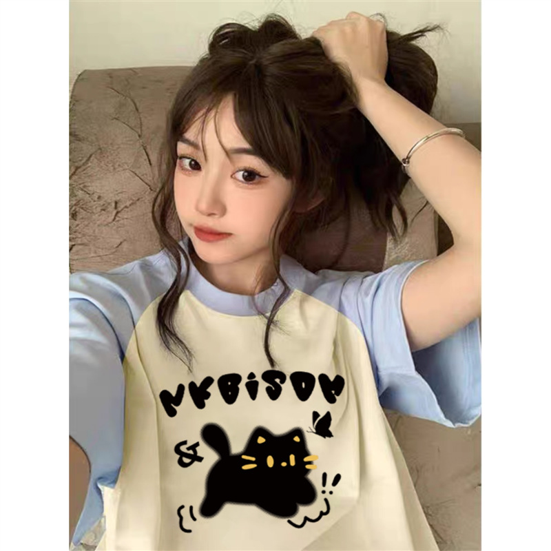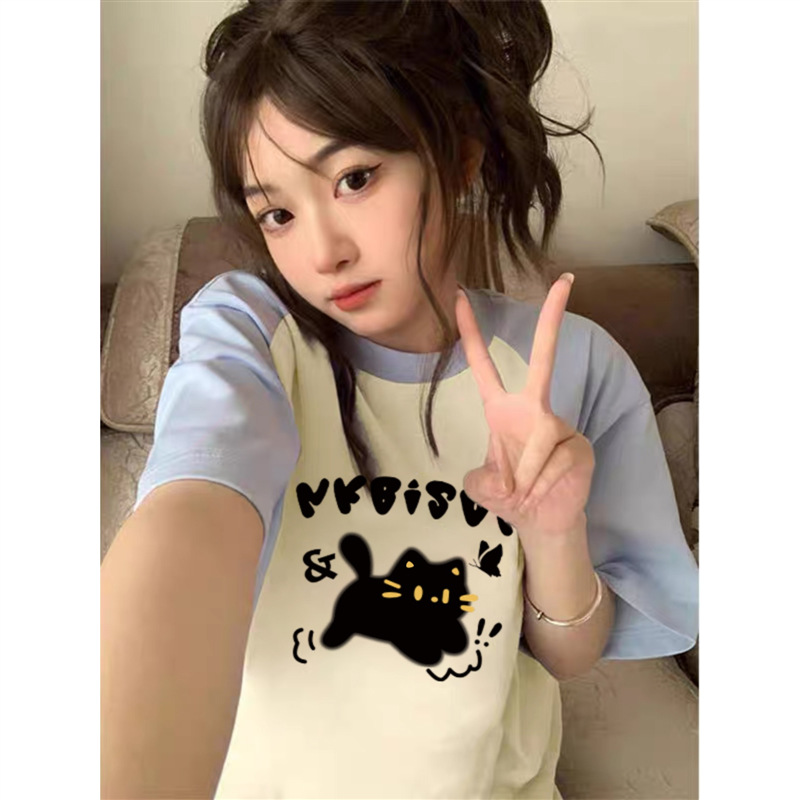 插肩拼色卡通短袖T恤女夏季新款美式复古设计感慵懒半袖上衣