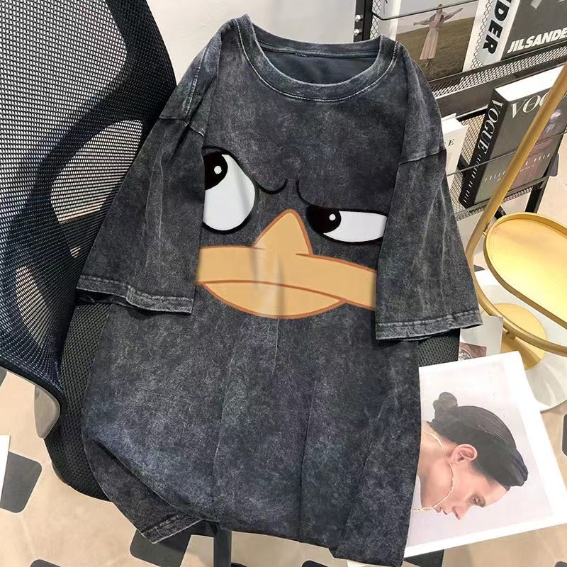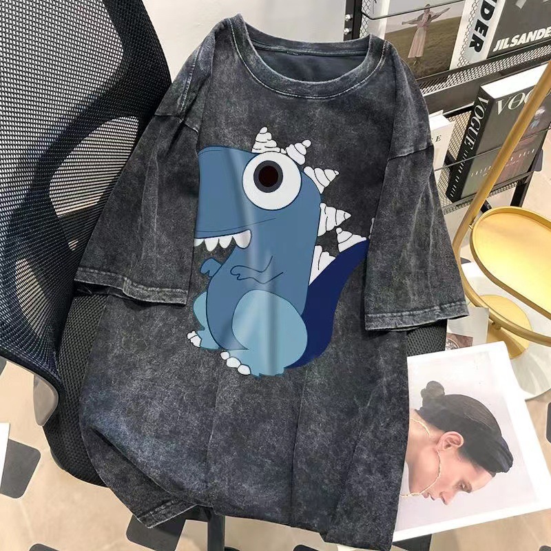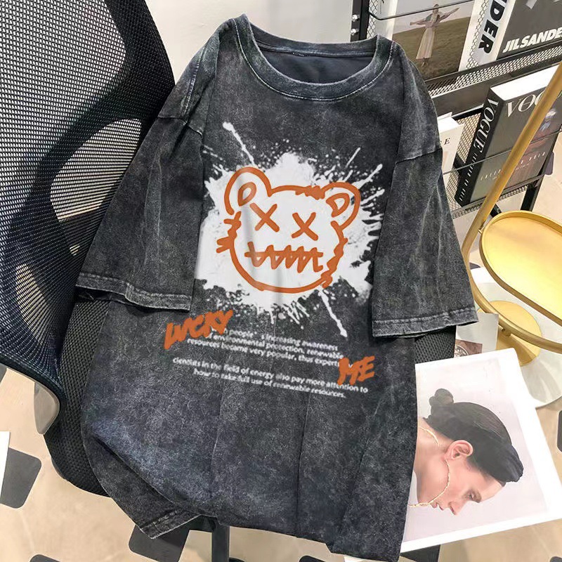 设计感小众草莓熊短袖t恤女新款夏季宽松水洗做旧纯棉上衣服