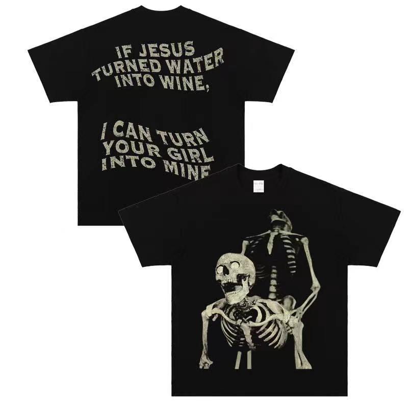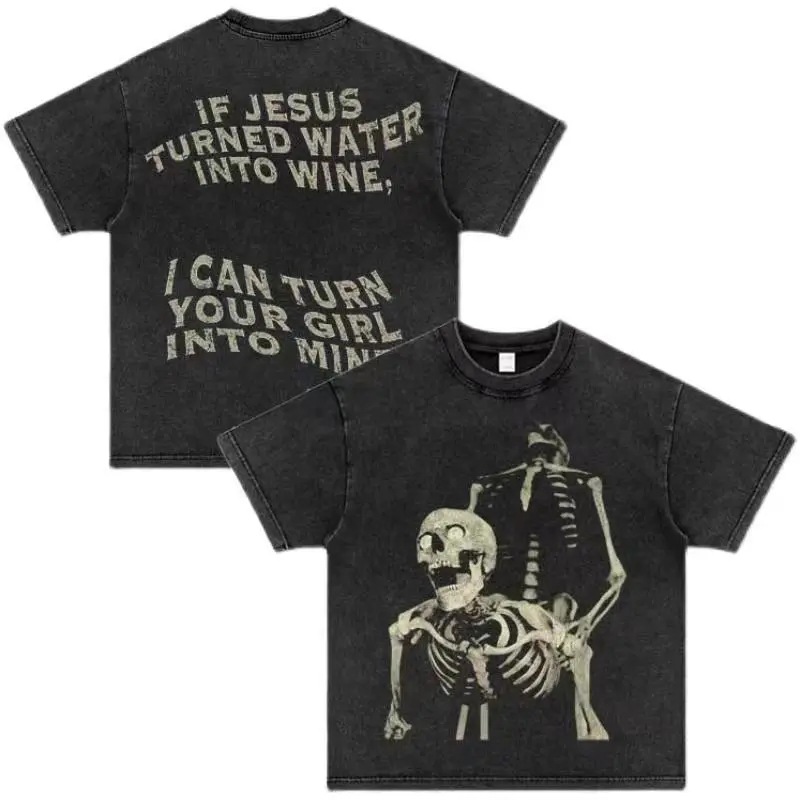 做旧水洗纯棉情侣装暗黑系骷髅美式小领口宽松休闲短袖T恤男女