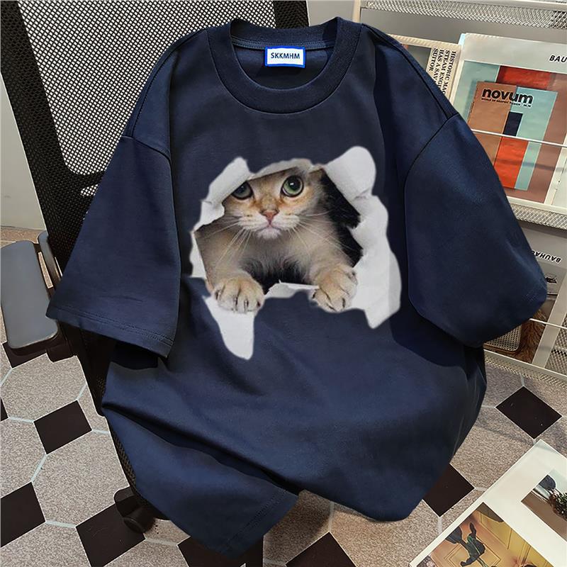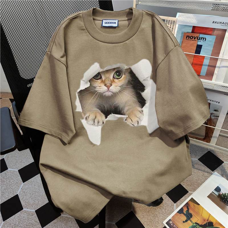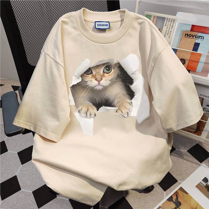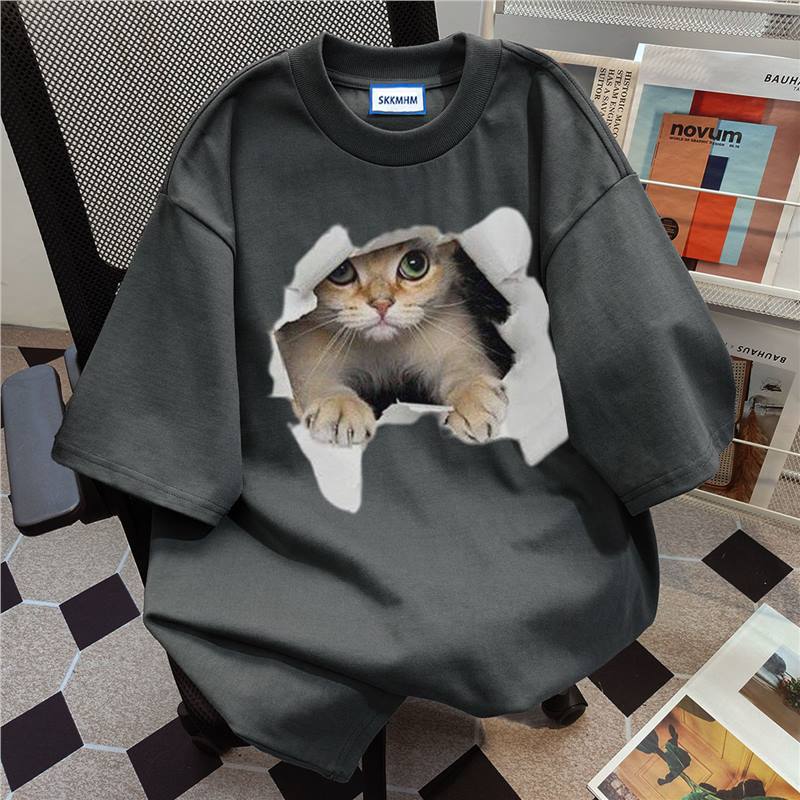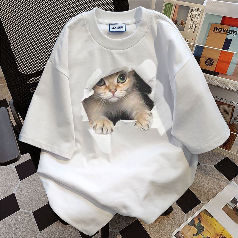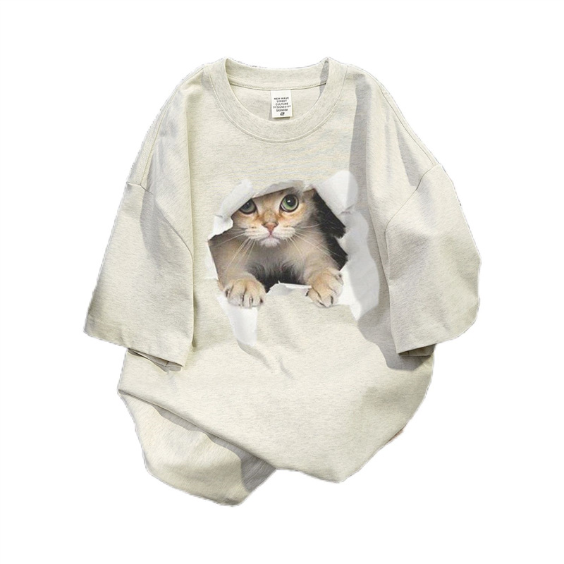 新款夏季美式卡通猫咪印花短袖t恤女白灰色圆领宽松纯棉上衣