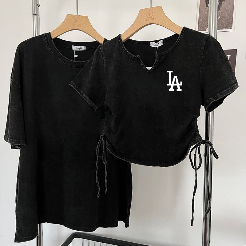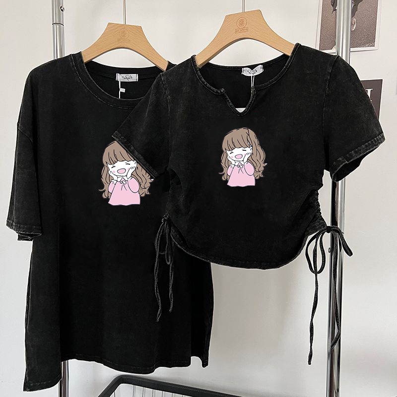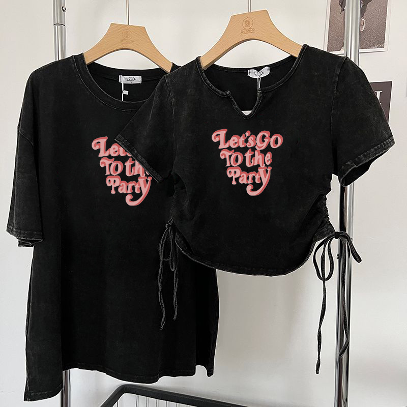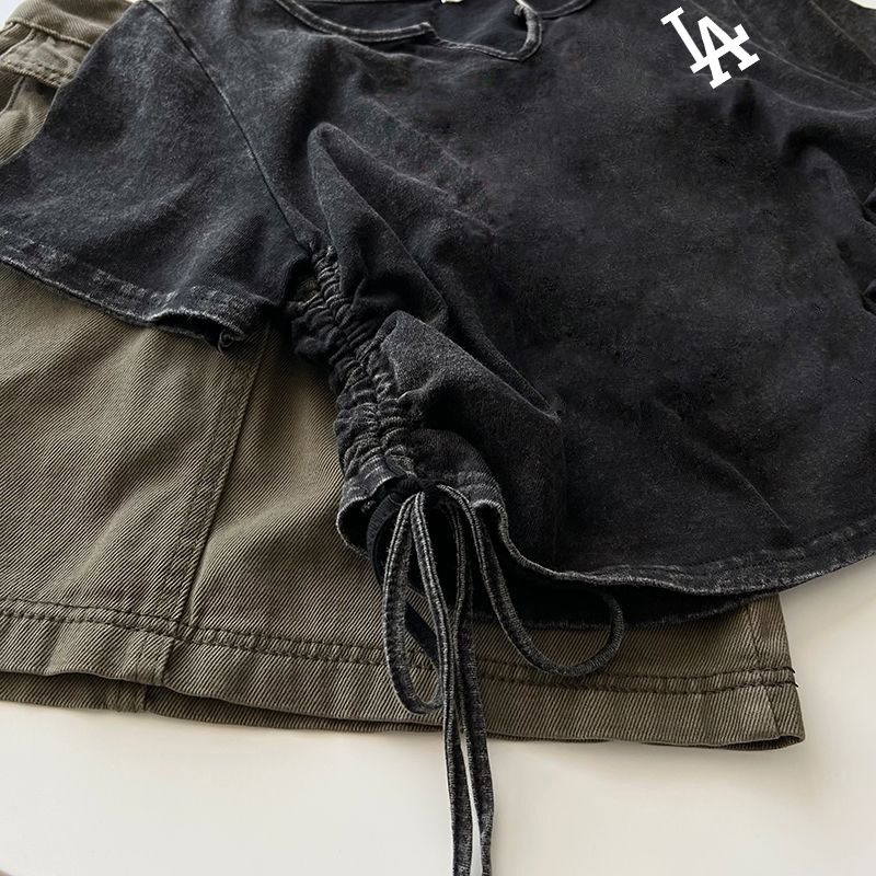复古水洗做旧短袖t恤女夏季情侣夏短款抽绳辣妹正肩美式辣妹上衣