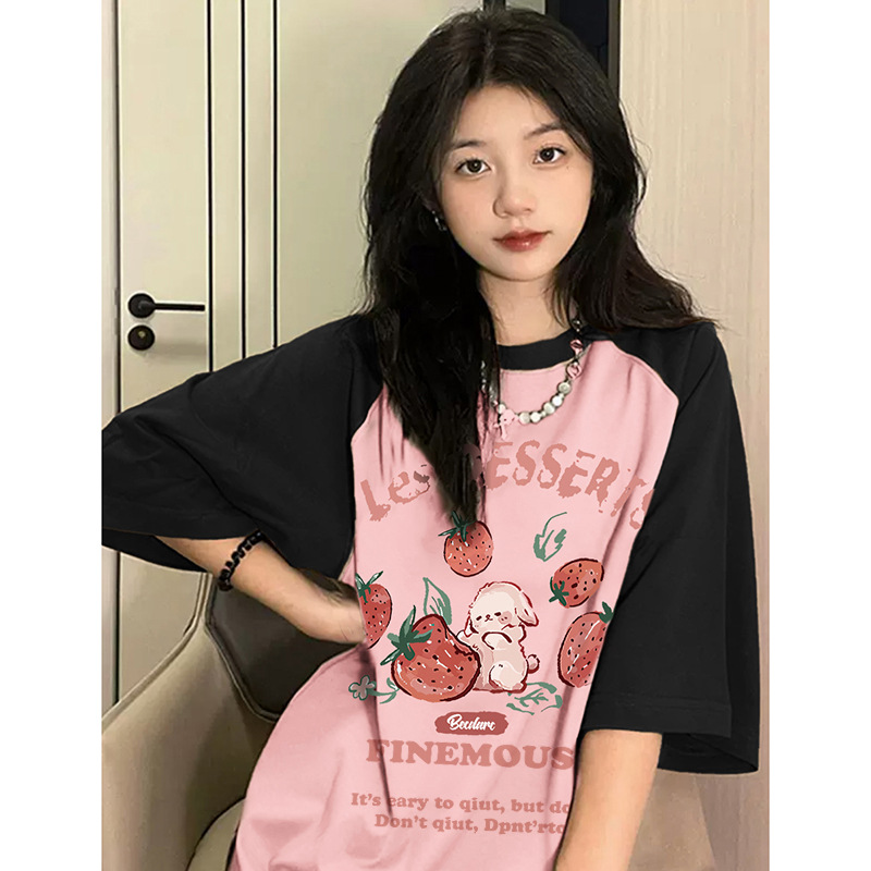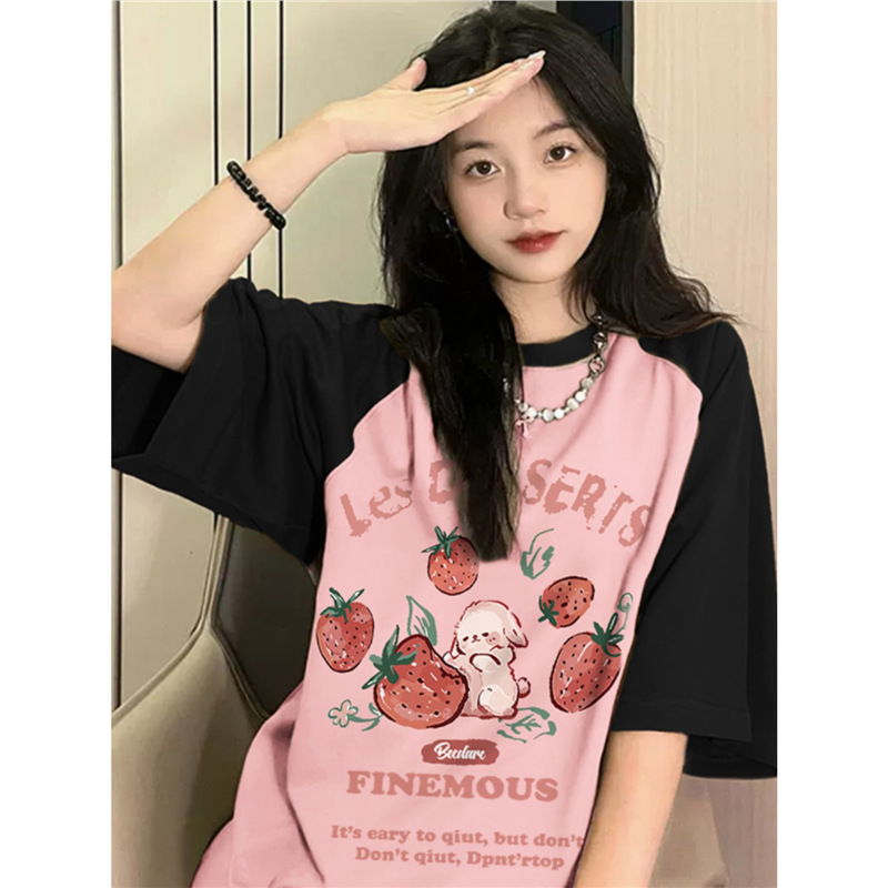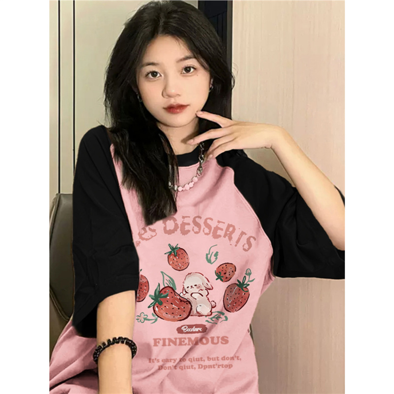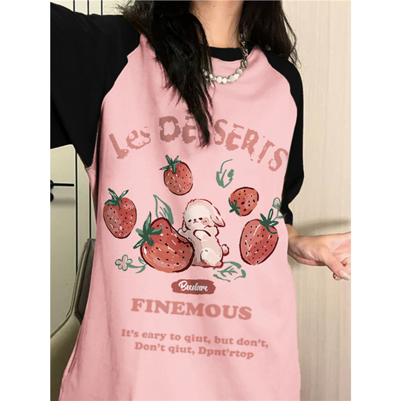 粉色拼接插肩袖T恤短袖大码胖mm显瘦撞色设计ins夏季甜酷纯棉上衣