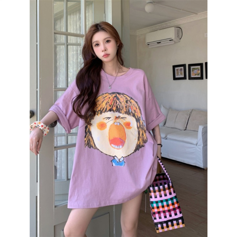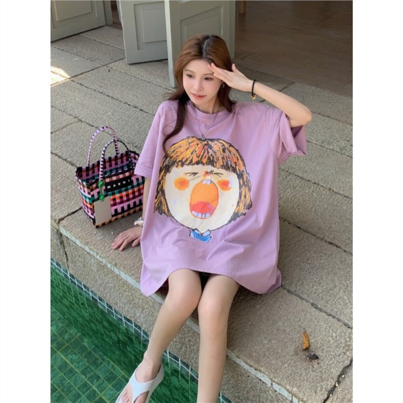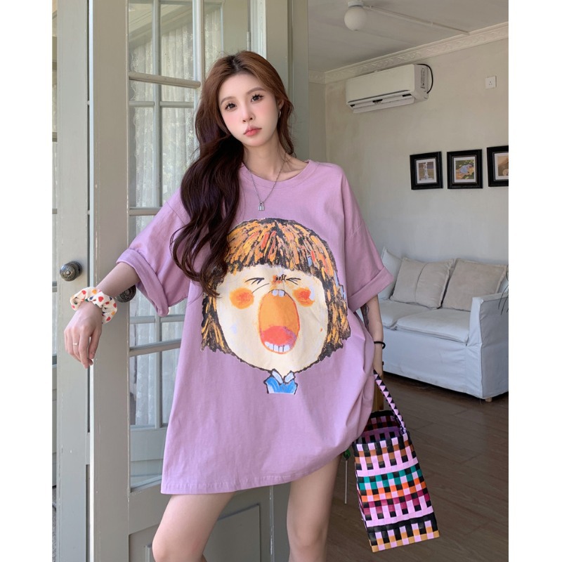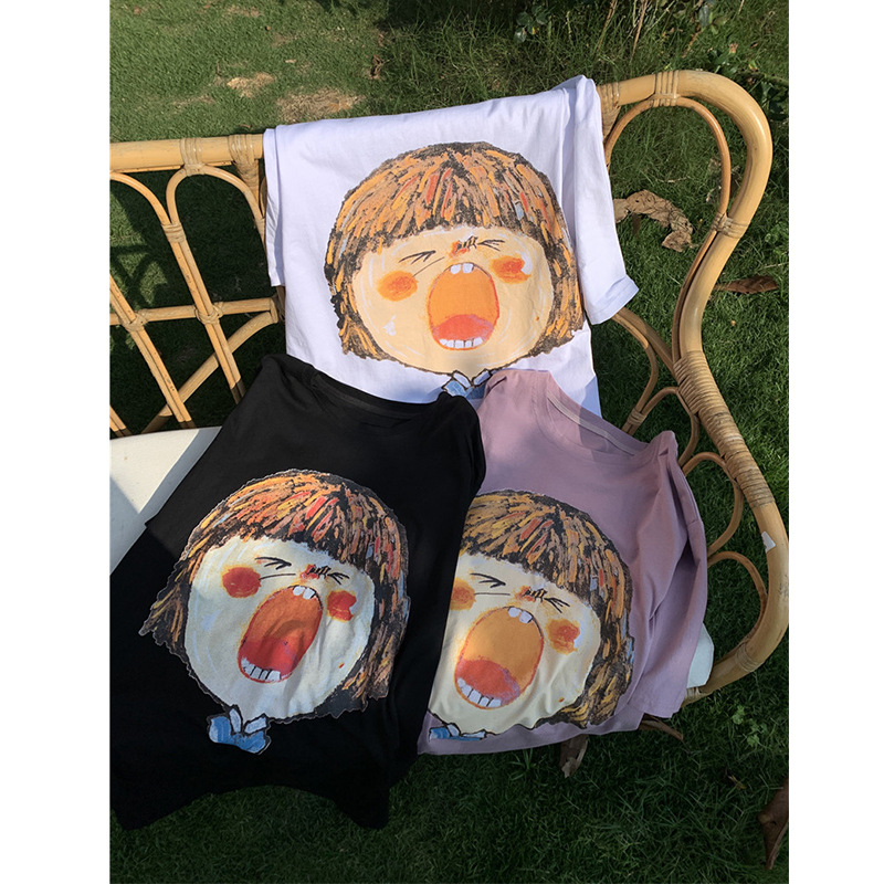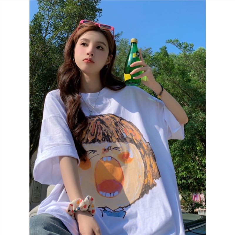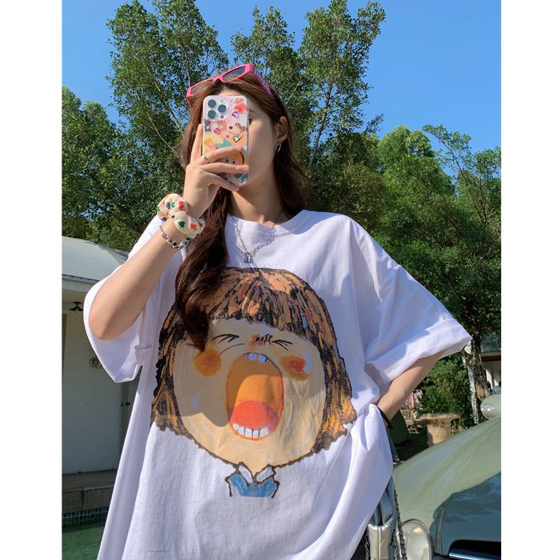 别致涂鸦印花白色t恤女短袖中长款宽松bf风休闲潮牌半袖夏季上衣