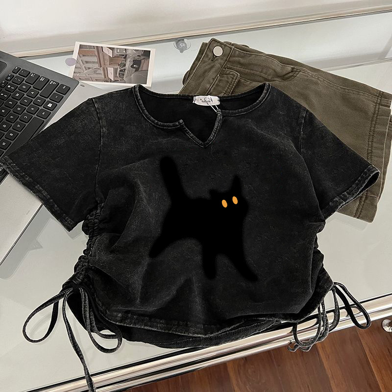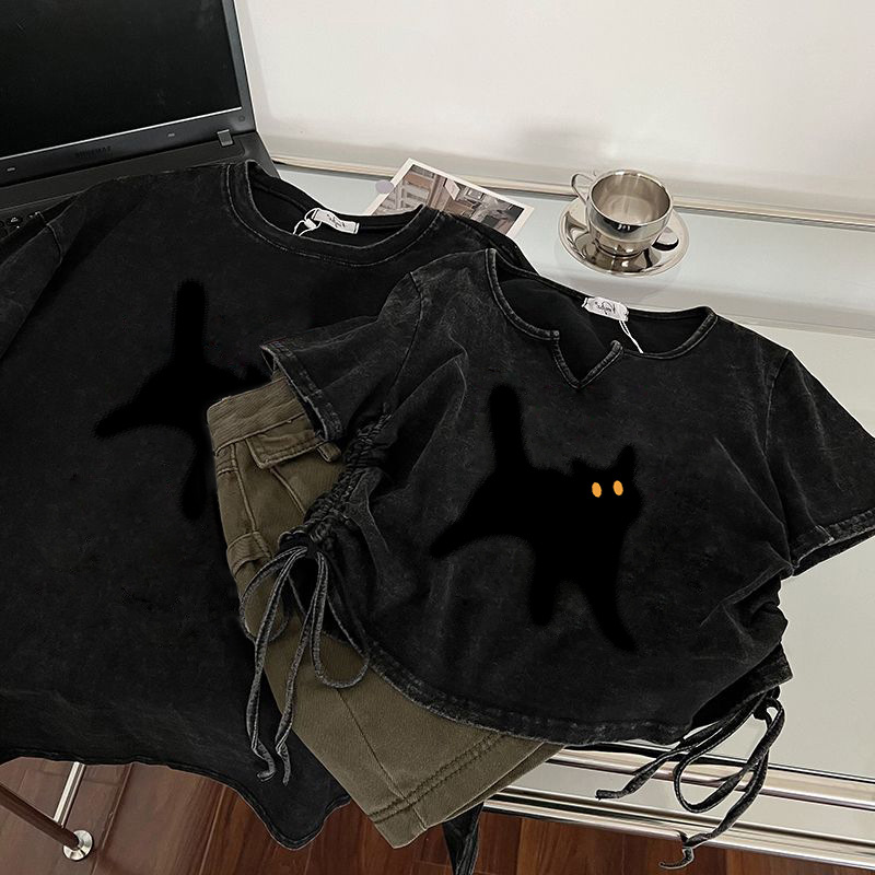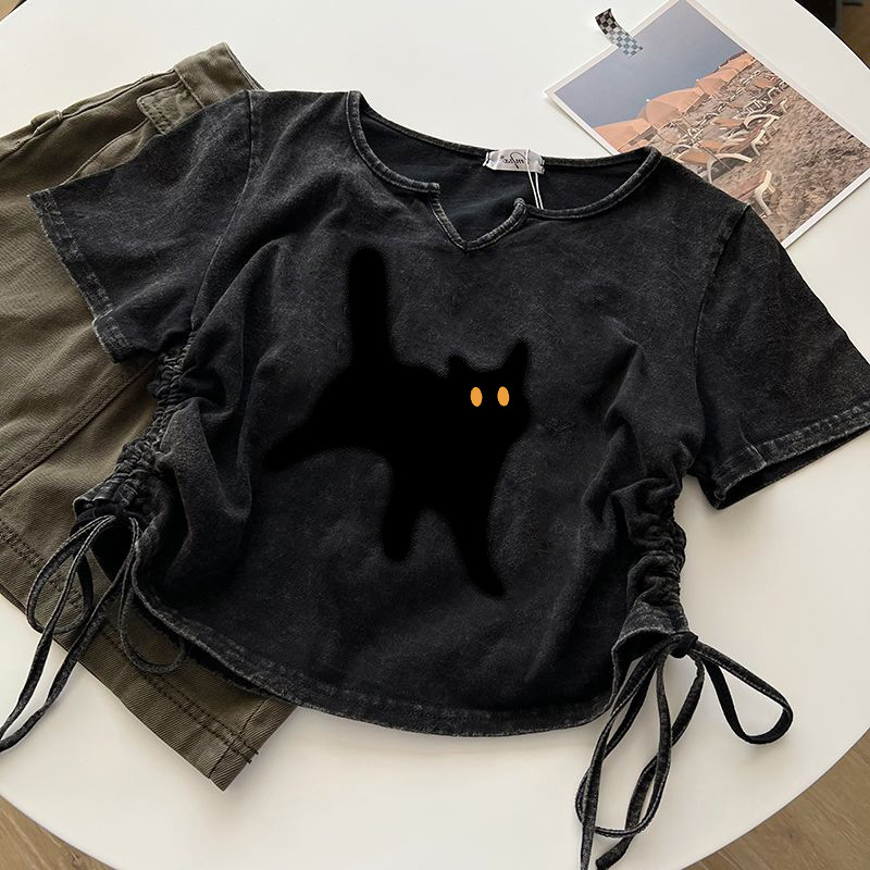 夏新款做旧水洗短T恤女宽松抽绳T恤辣妹上衣情侣款一长一短