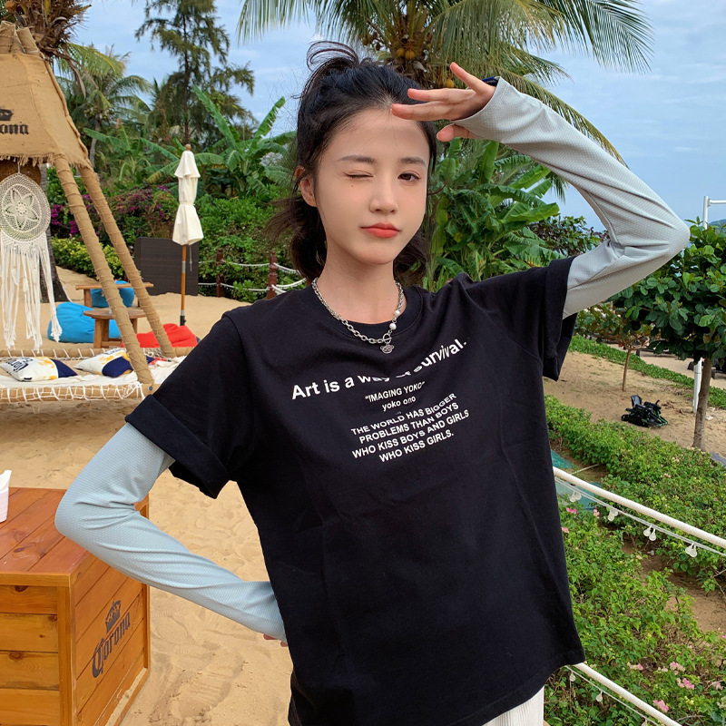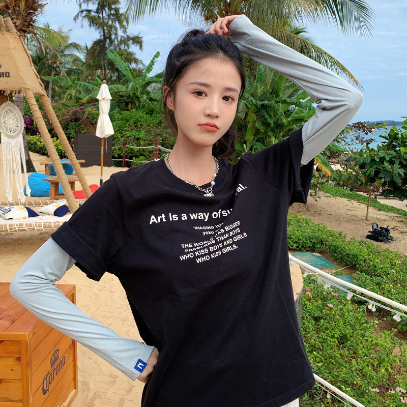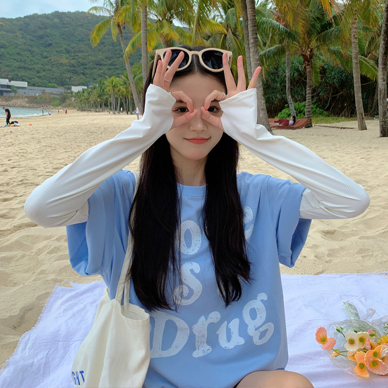 日系冰丝冰袖夏季防晒手袖纯色网眼带标护臂袖套长款防紫外线手套