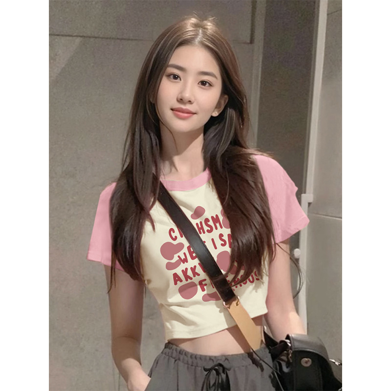 插肩撞色短款百搭短袖t恤女甜辣独特小众字母印花小衫上衣