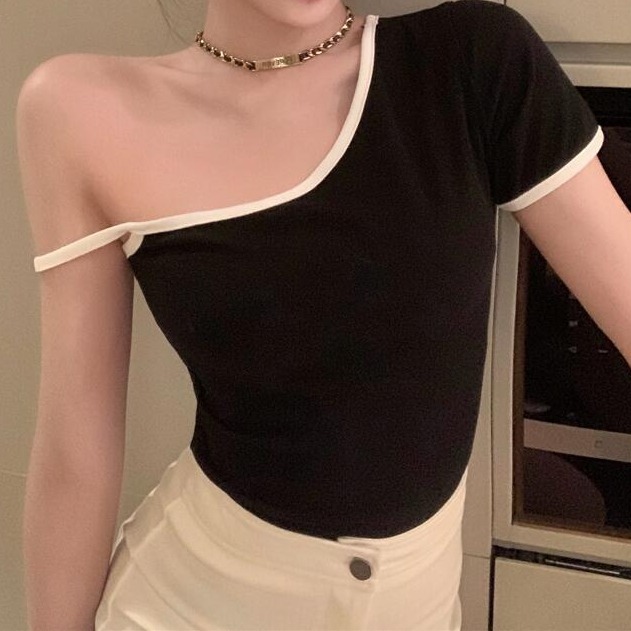 黑色辣妹吊带半袖T恤女夏季设计感独特别致修身露背短款上衣