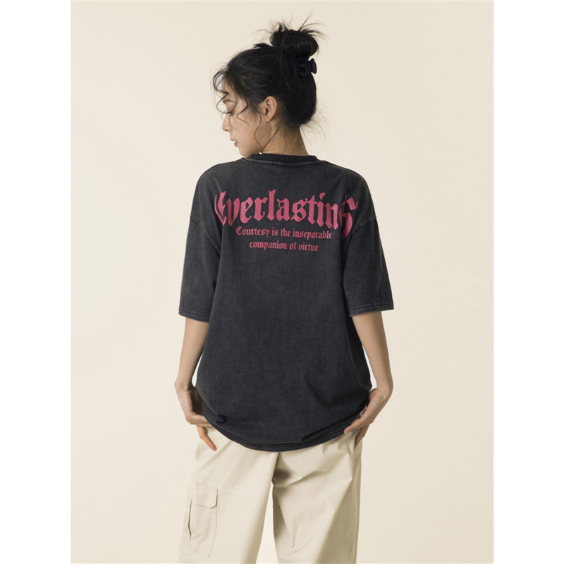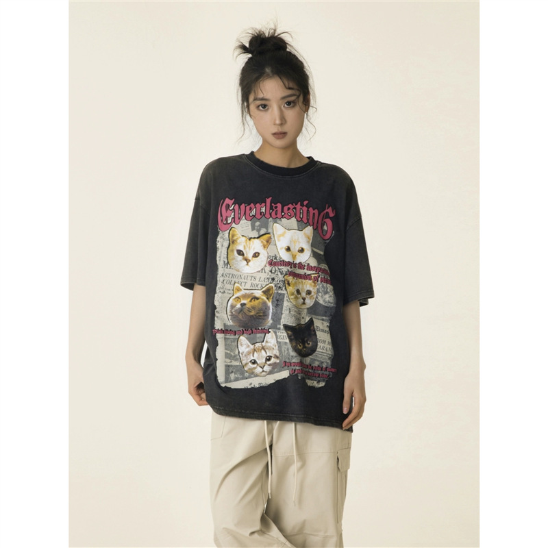 欧美暗黑亚比风水洗做旧短袖T恤女情侣潮牌猫咪上衣