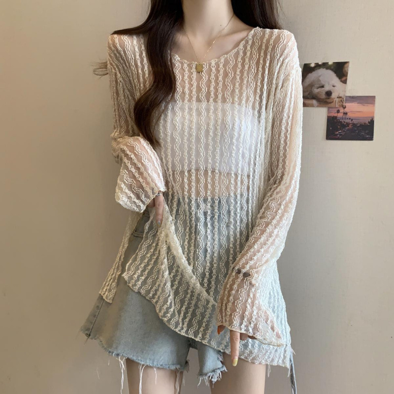 薄款白色蕾丝镂空防晒罩衫女夏季大码胖mm显瘦设计感开叉辣妹上衣