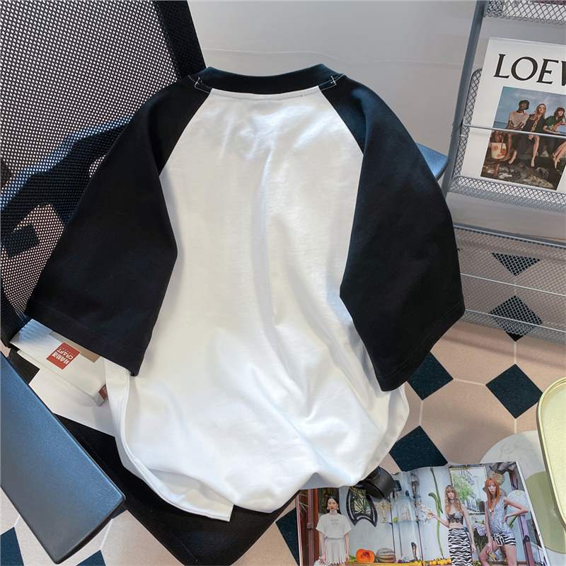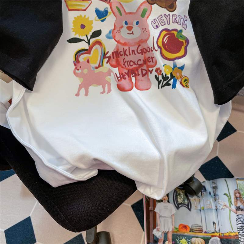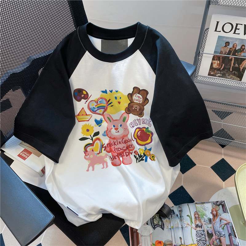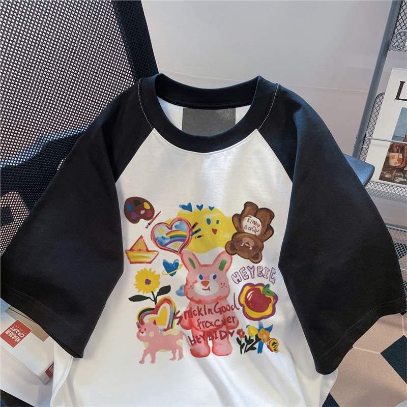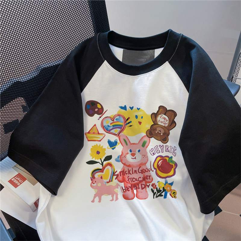 夏季艺术生奶乖涂鸦卡通印花短袖t恤女新款小个子插肩袖上衣