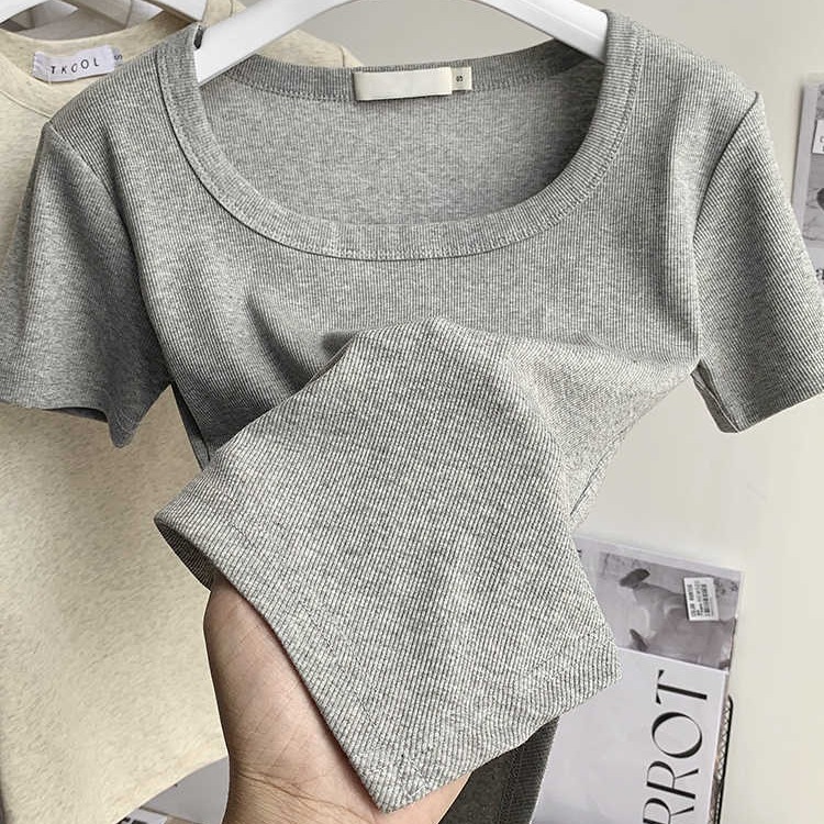 下摆不规则螺纹方领t恤女夏季新款修身短款u领设计感短袖上衣