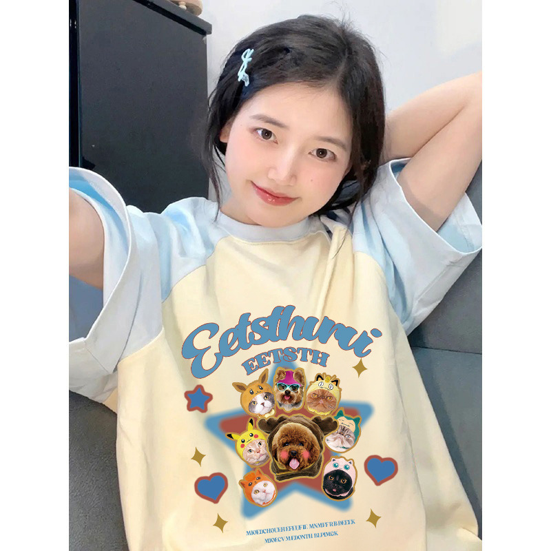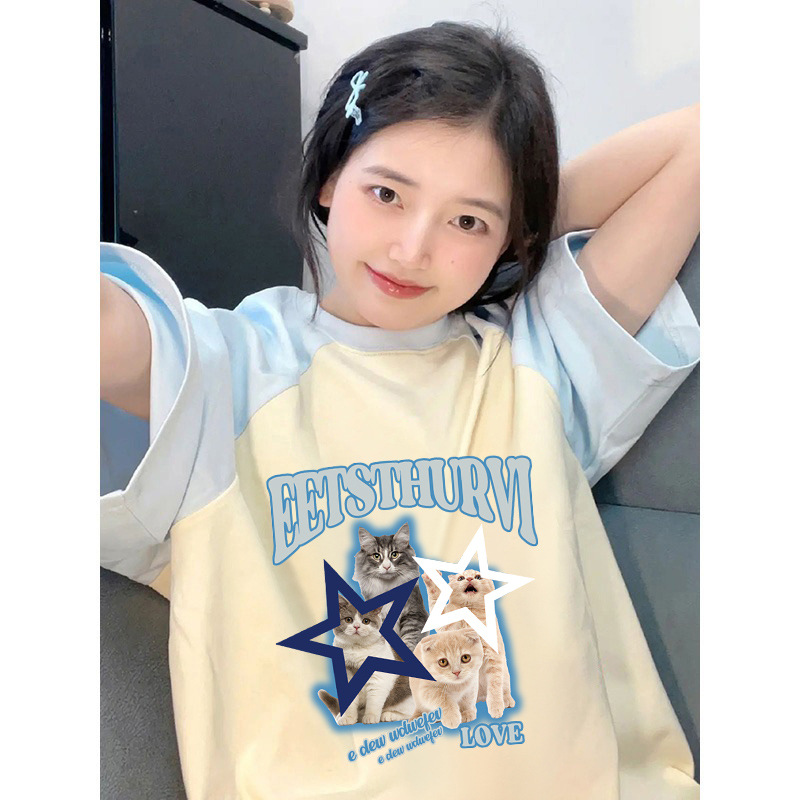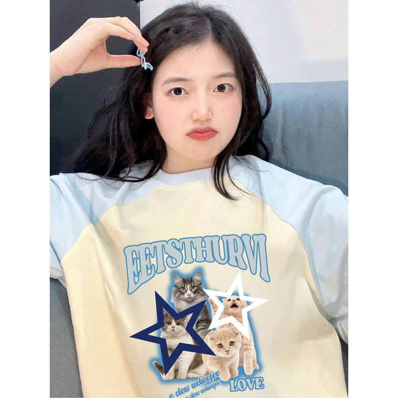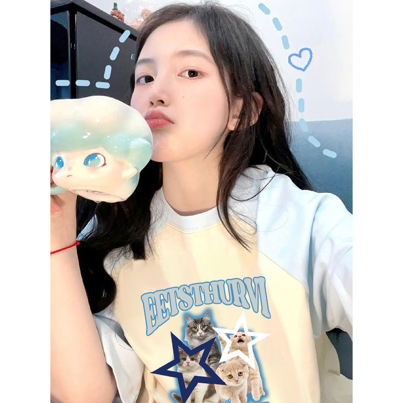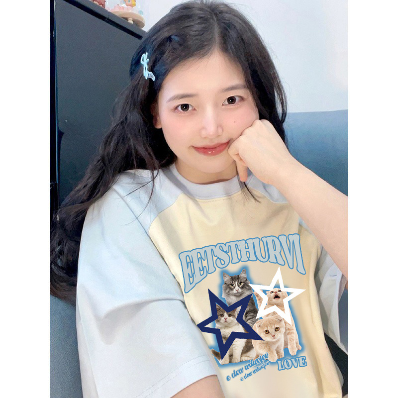 重磅纯棉拼色插肩短袖T恤女夏季宽松多巴胺穿搭甜酷情侣半袖上衣