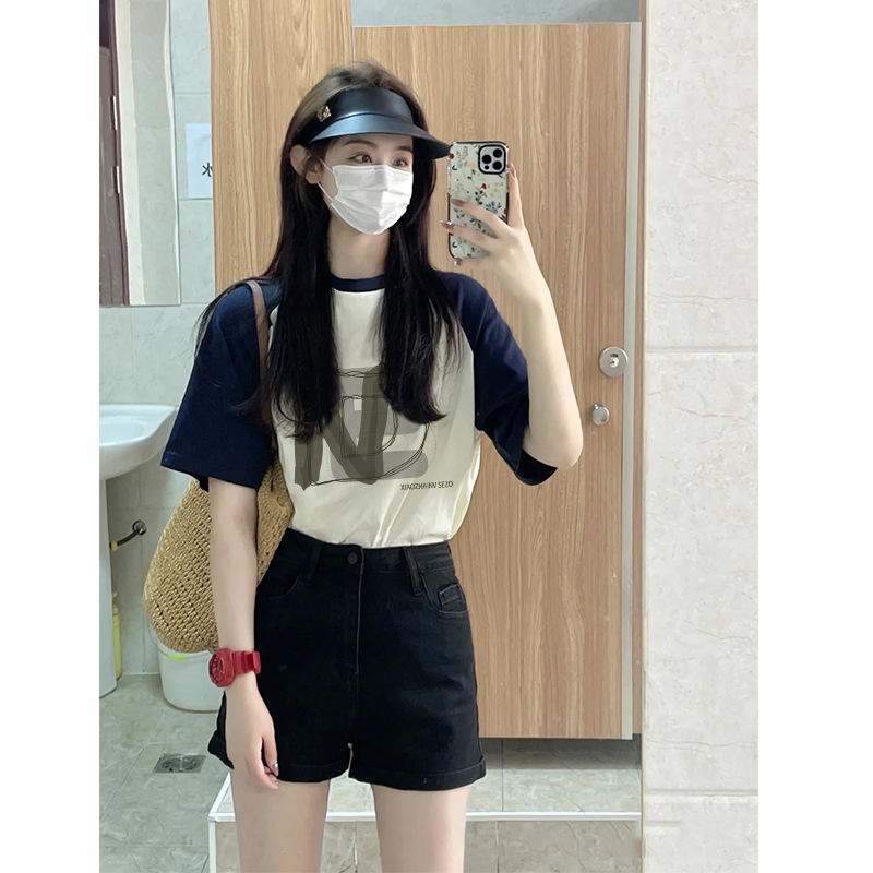 撞色短袖t恤夏季新款女装复古高级感漂亮时尚插肩袖上衣潮ins