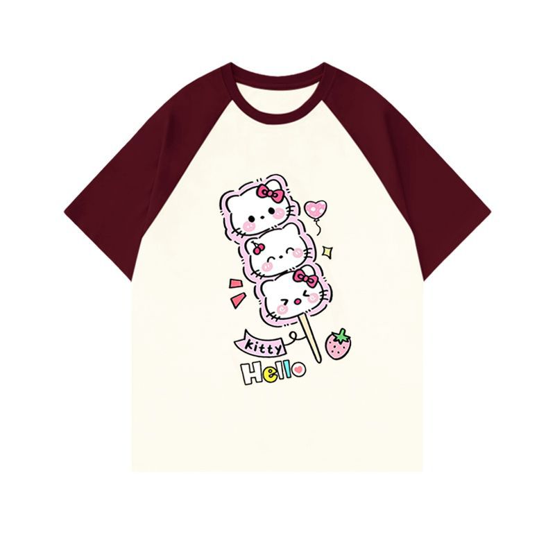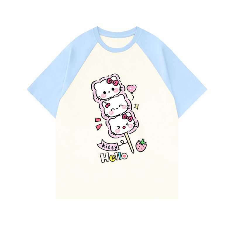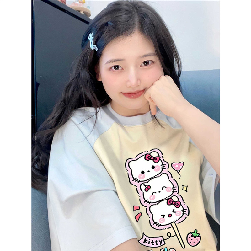 HelloKitty200斤纯棉蓝色插肩t恤闺蜜装夏季女多巴胺宽松显瘦上衣