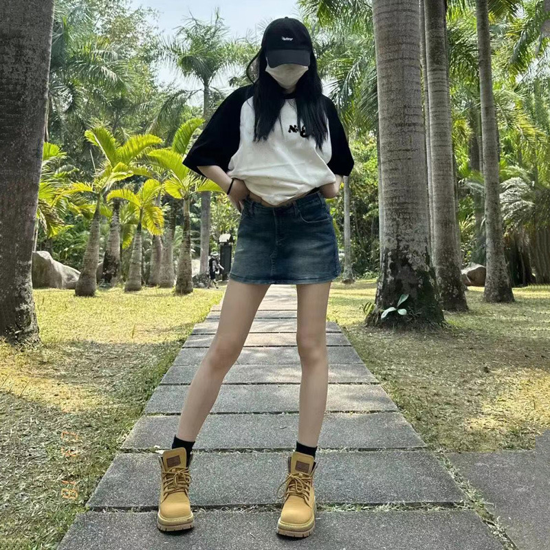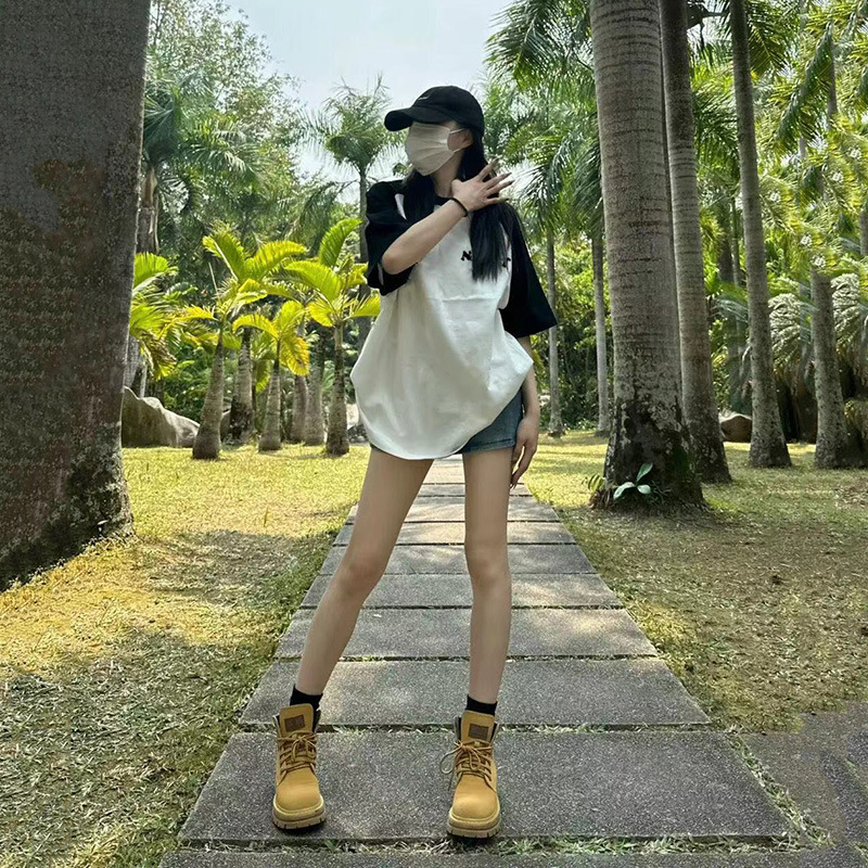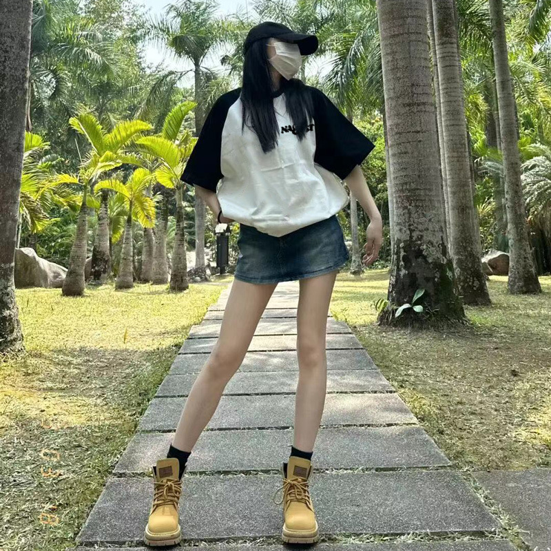 白色黑边插肩t恤女高中生美式新款初中生纯棉短袖中性风上衣