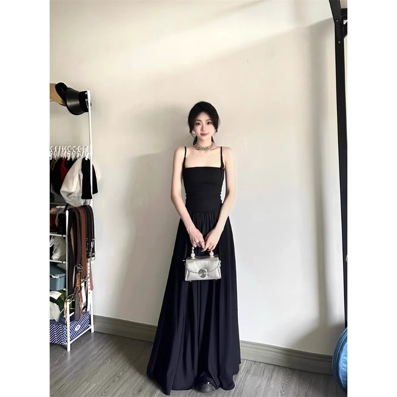 高级感黑色吊带连衣裙女夏季法式赫本温柔风海边度假超好看长裙子