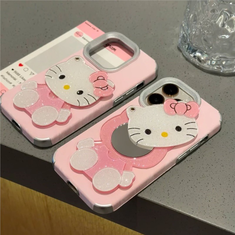 粉色KT猫镜子粉雪山纹适用iPhone16Promax苹果15壳13高级感12