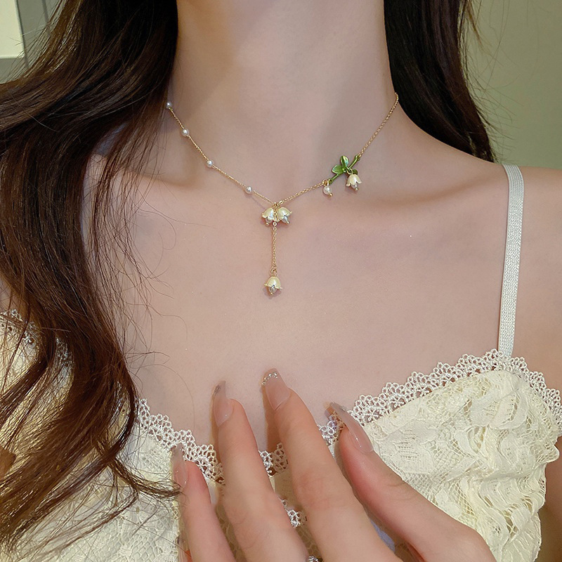 日韩ins风合金铃兰花仿珍珠项链 新款女个性吊坠流苏锁骨链