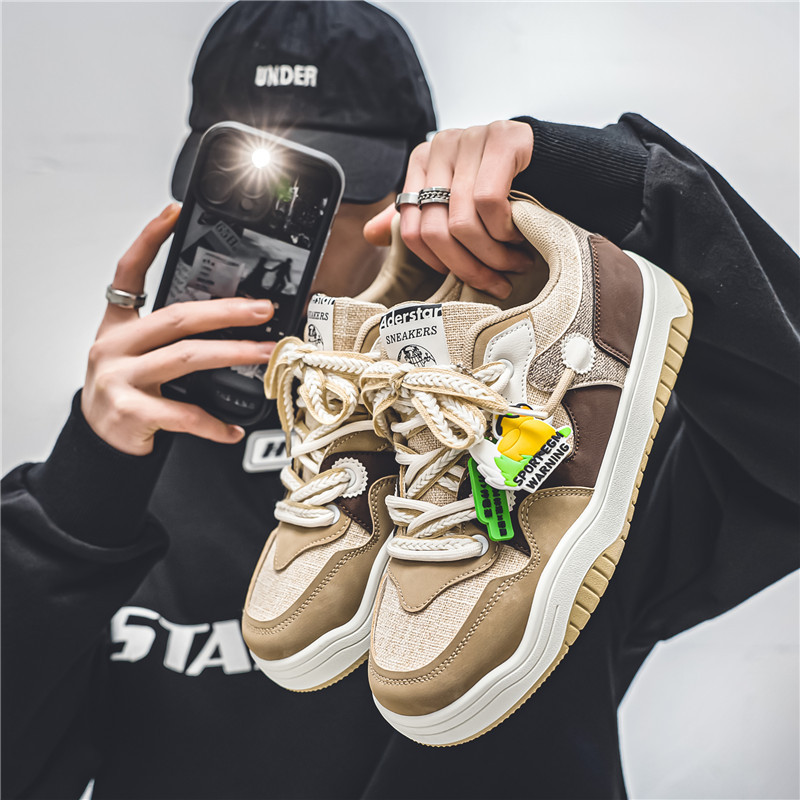 春夏小众牛仔布拼接皮面透气板鞋复古港风潮搭男